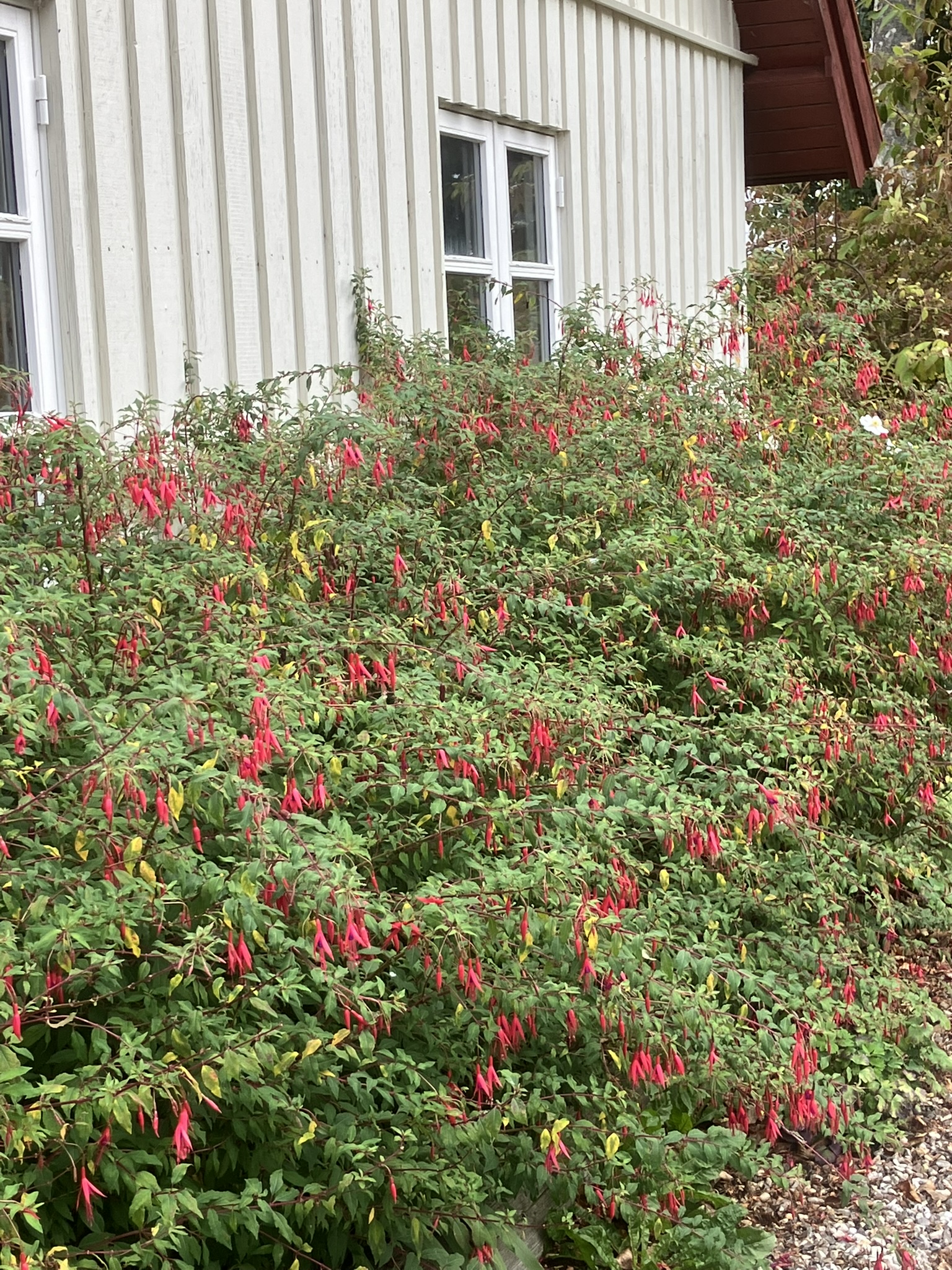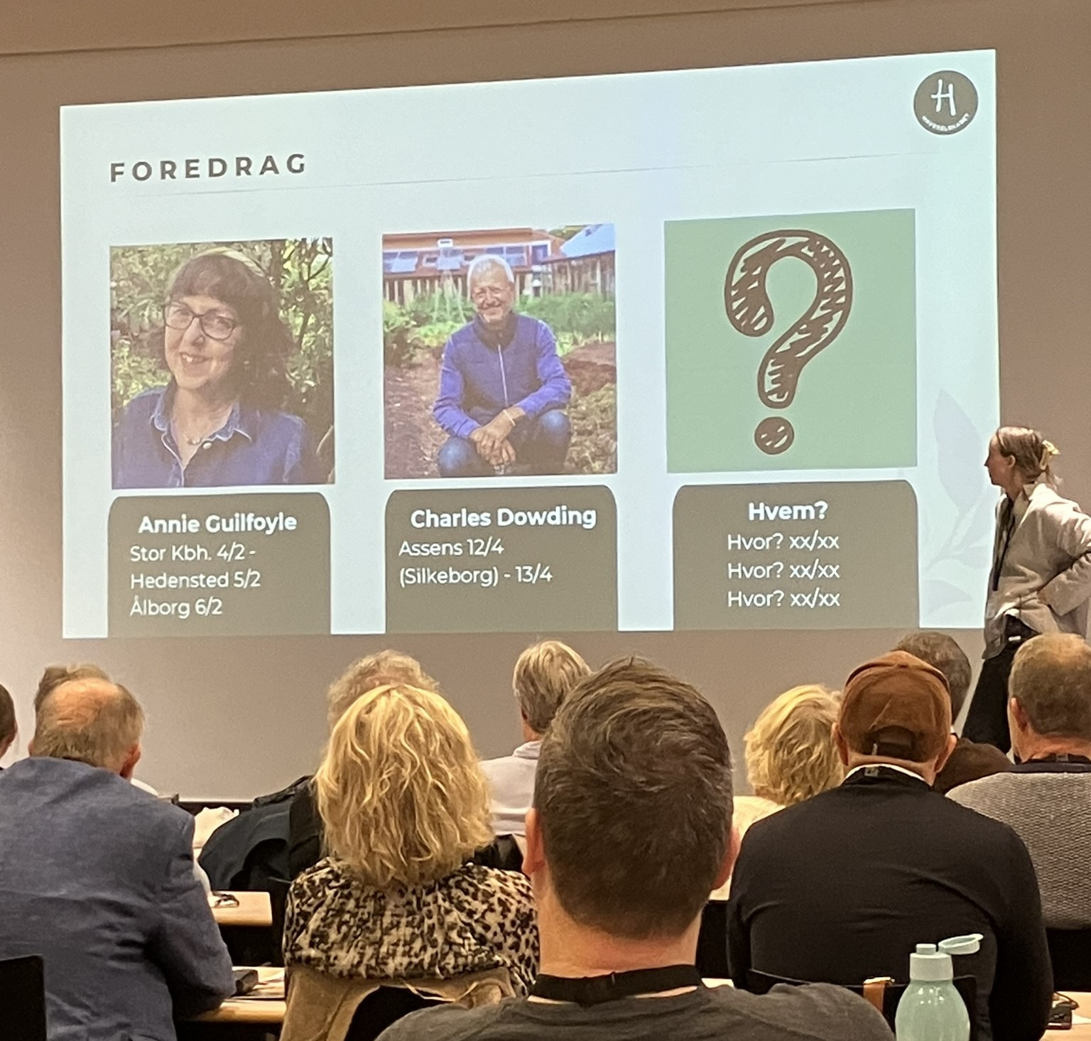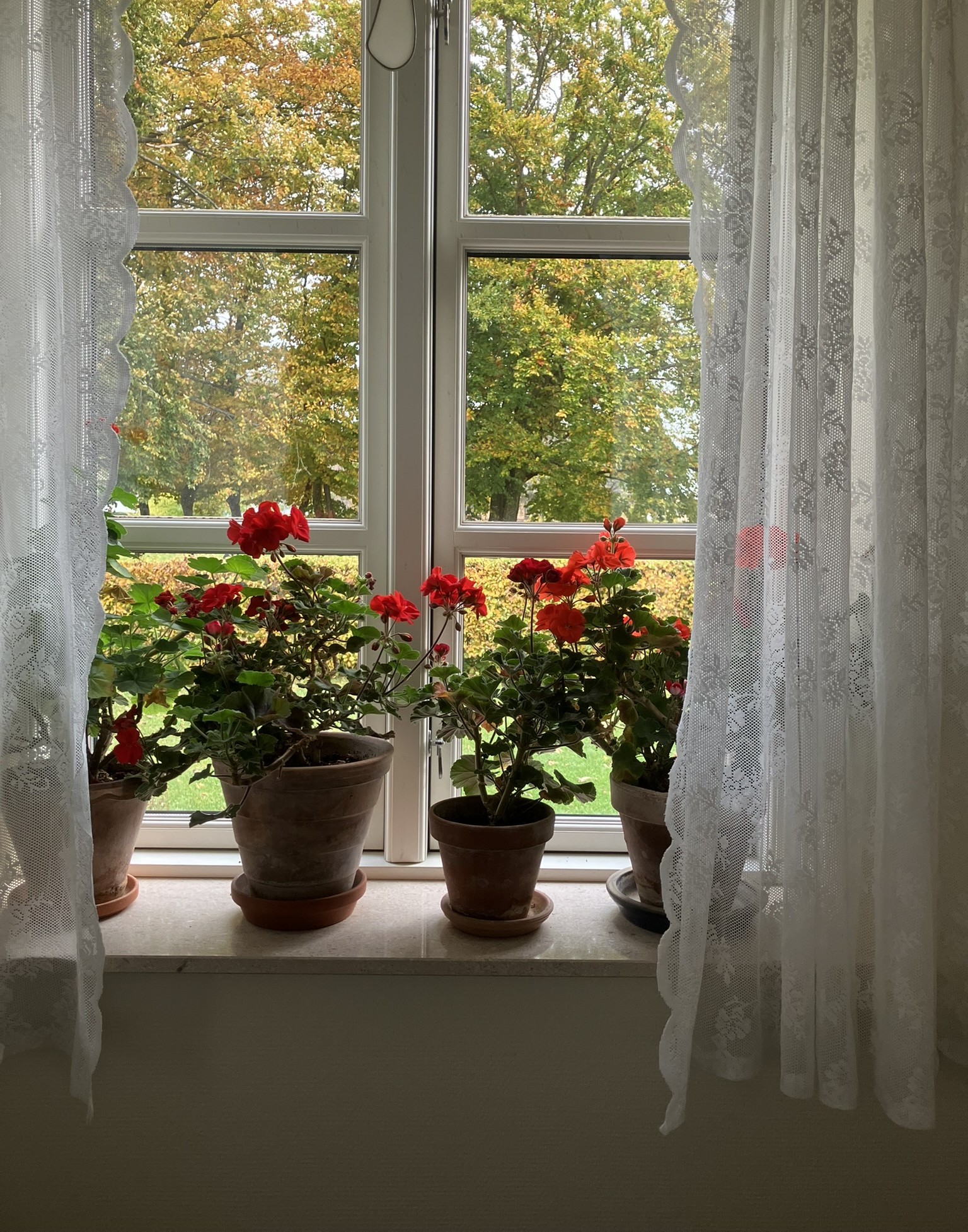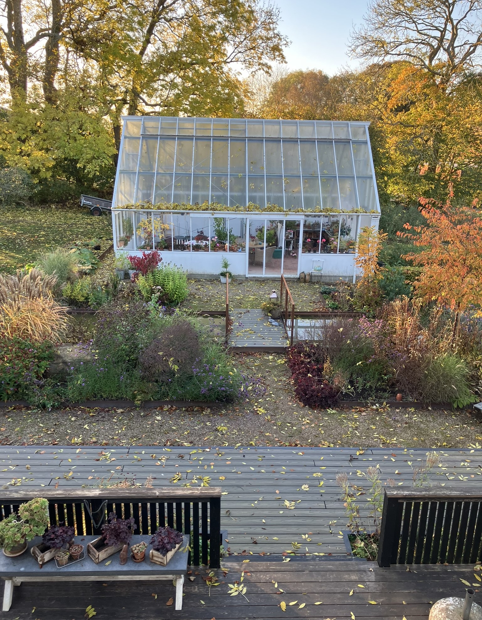 Endelig har jeg fået indhentet lidt af det forsømte i haven. Det er vel nok flot med de gyldne blade, og vi har ikke haft blæst af betydning, så de ligger der endnu. Jeg river kun blade sammen på grusbelægningen, andre steder må de blive liggende. Hvad gør I? Den smukke klatrerose Nordina blomster lige til frosten kommer. Det sidste i drivhuset blev ryddet i går med hjælp af børnearbejde:) To børnebørn hjalp til med at flytte ca. 70 pelargonier indenhus. De hentede de sidste caféstole og høstede de få Ingrid Marieæbler der ikke var spist af fuglene. Det sidste billede er fra Haveselskabets formandsmøde 2. november. Det viser hvilke foredrag vi kan glæde os til i 2025, hvor og hvornår (jeg tror nok der er forbehold for evt. rettelser).