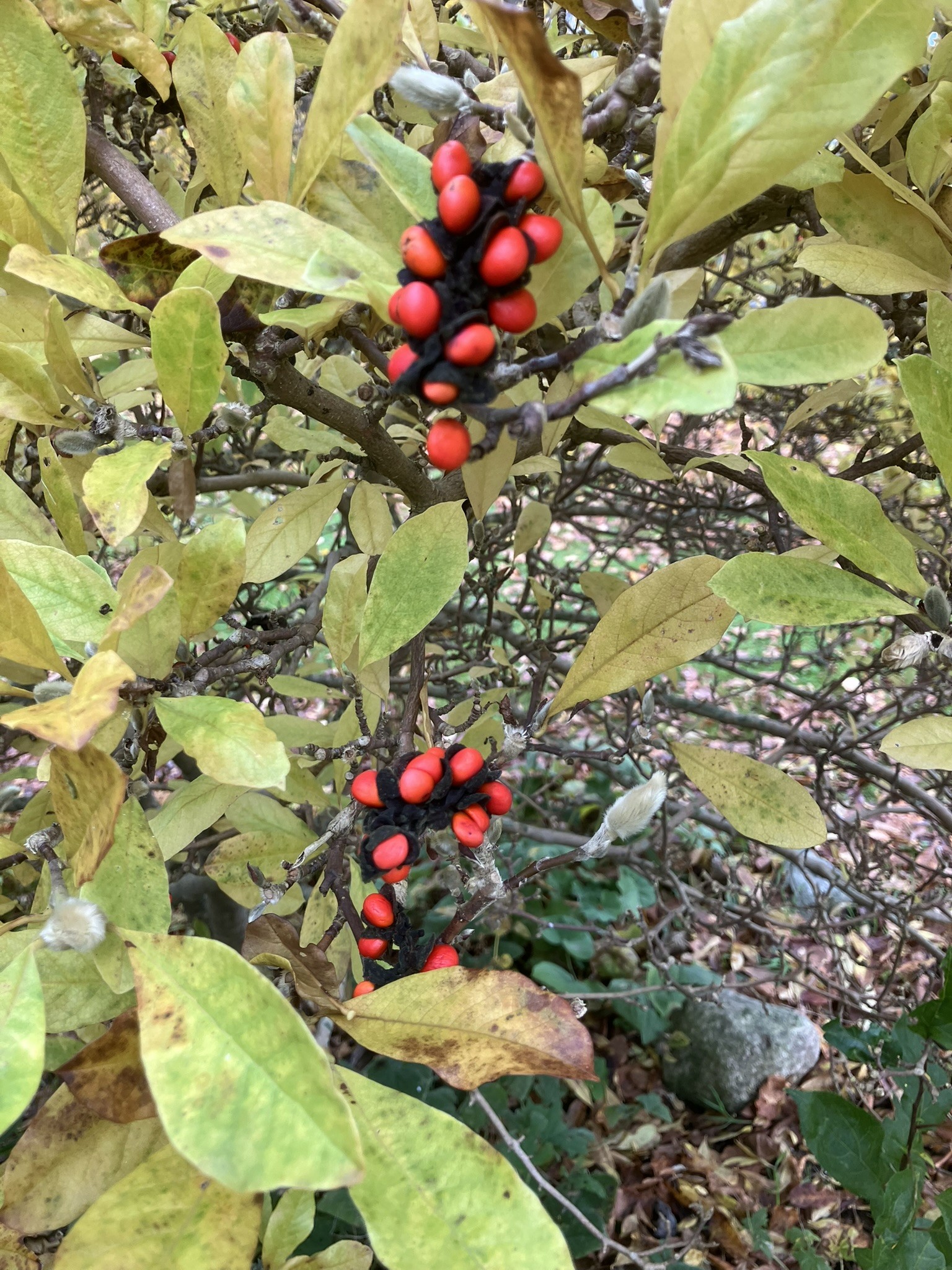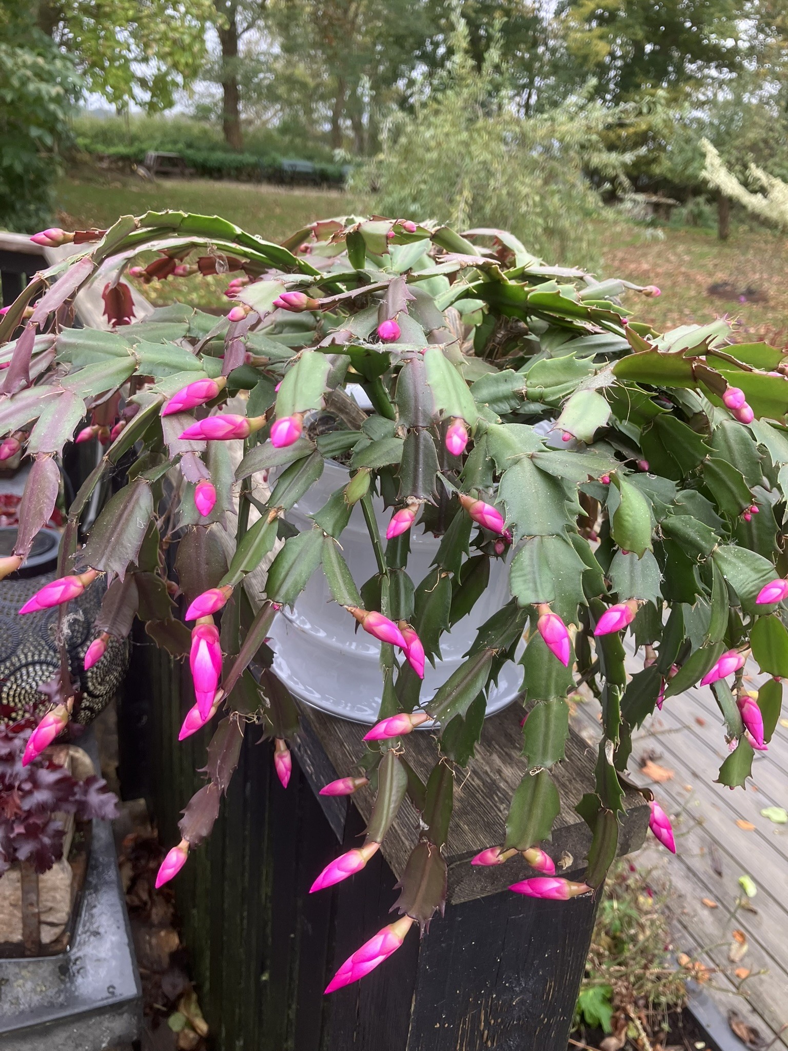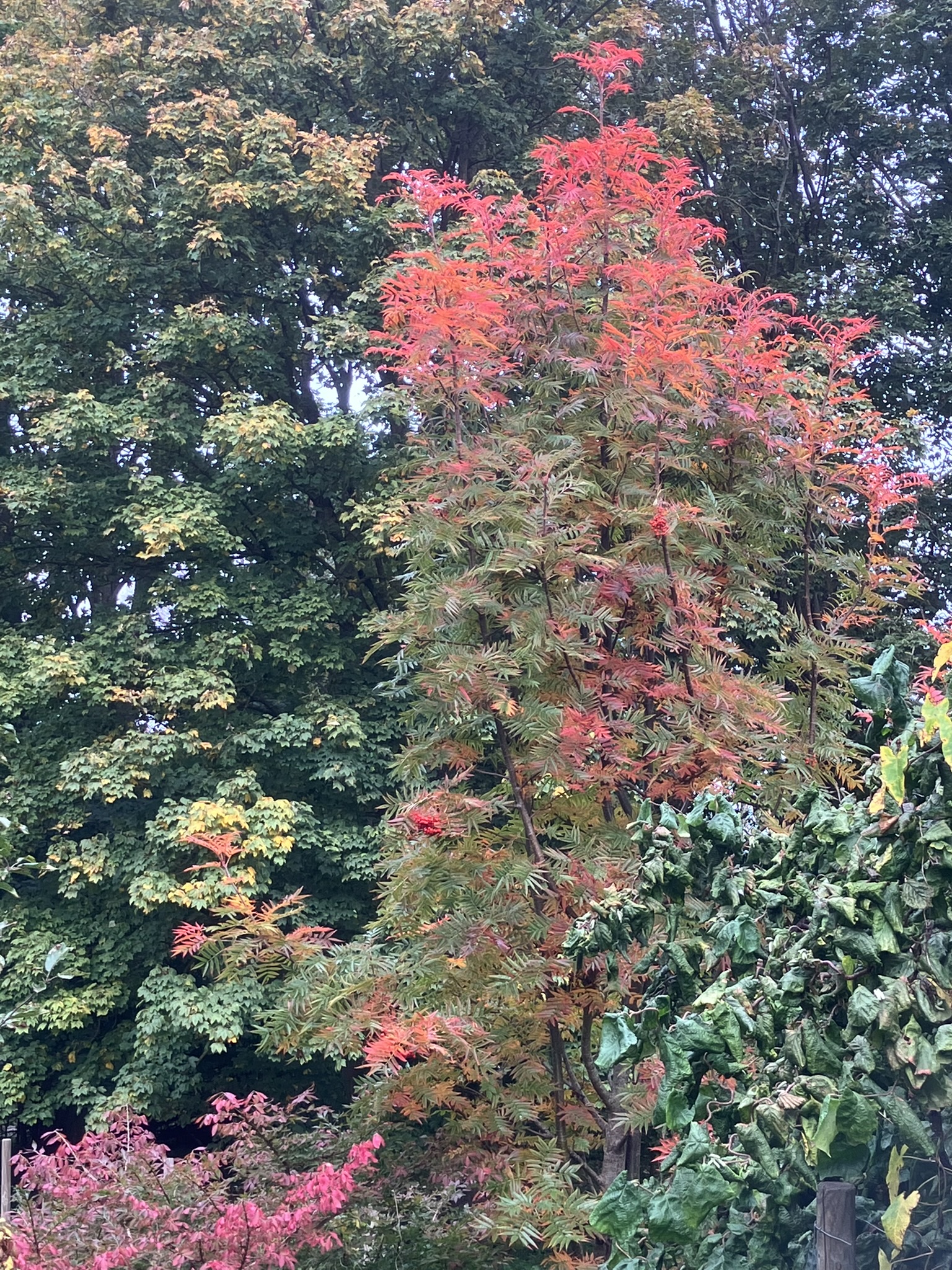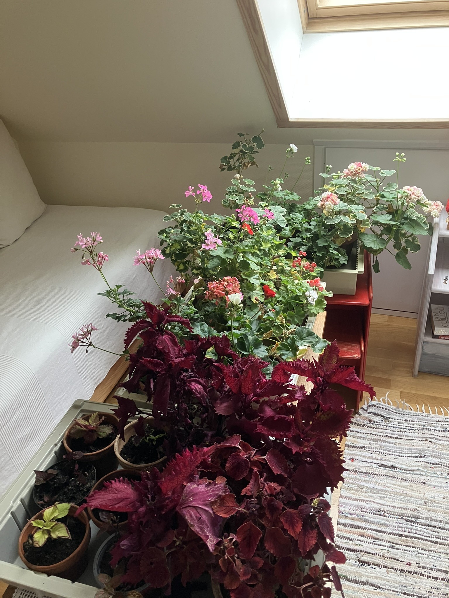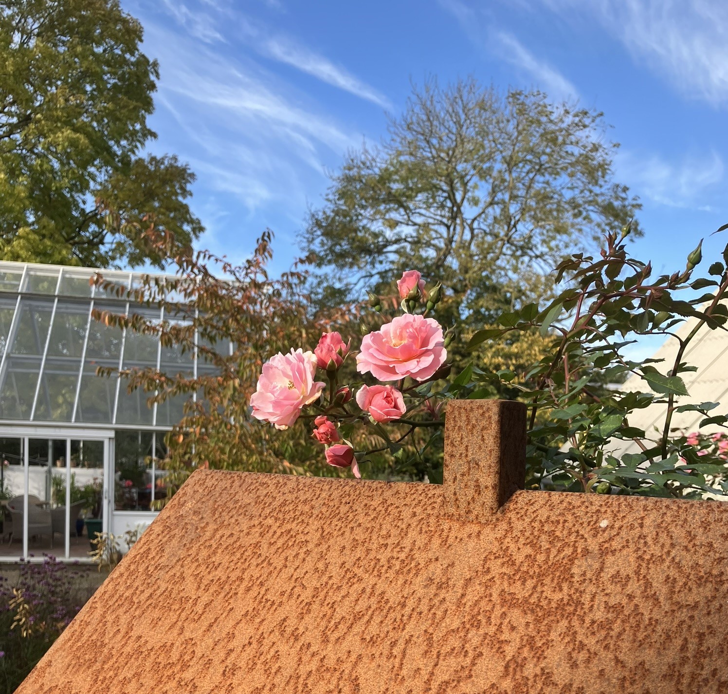 Endelig har jeg fået indhentet lidt af det forsømte i haven. Det er vel nok flot med de gyldne blade, og vi har ikke haft blæst af betydning, så de ligger der endnu. Jeg river kun blade sammen på grusbelægningen, andre steder må de blive liggende. Hvad gør I? Den smukke klatrerose Nordina blomster lige til frosten kommer. Det sidste i drivhuset blev ryddet i går med hjælp af børnearbejde:) To børnebørn hjalp til med at flytte ca. 70 pelargonier indenhus. De hentede de sidste caféstole og høstede de få Ingrid Marieæbler der ikke var spist af fuglene. Det sidste billede er fra Haveselskabets formandsmøde 2. november. Det viser hvilke foredrag vi kan glæde os til i 2025, hvor og hvornår (jeg tror nok der er forbehold for evt. rettelser).