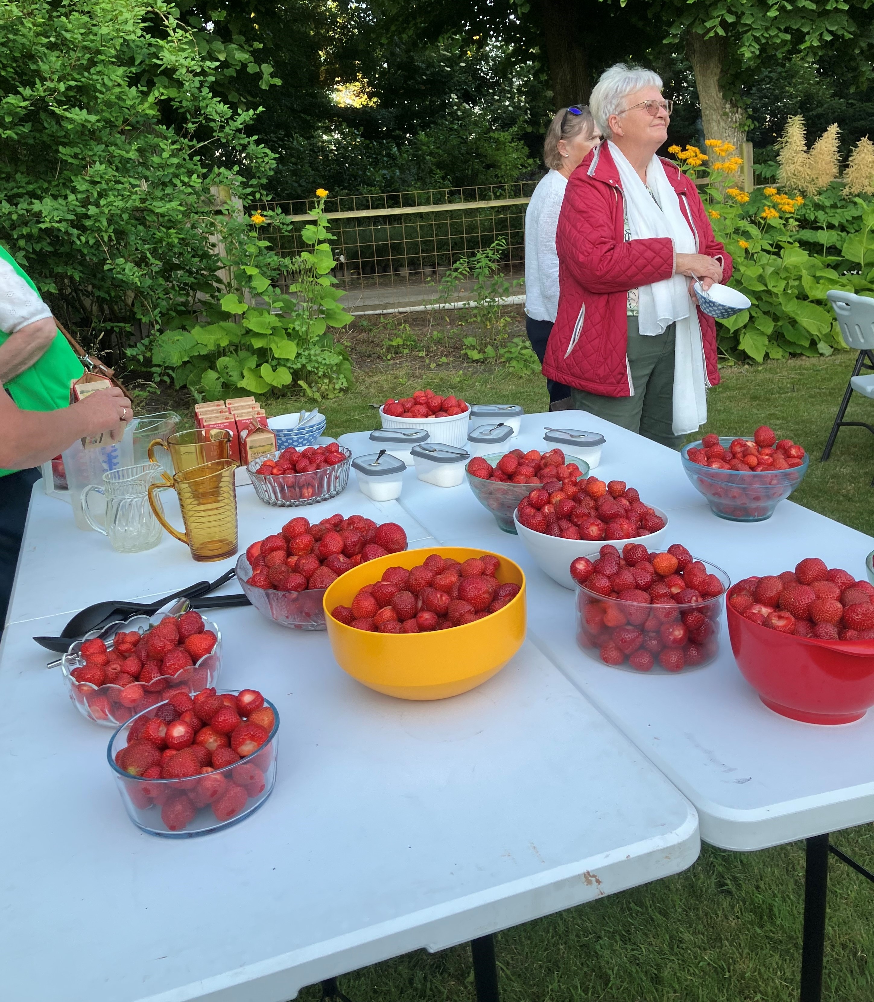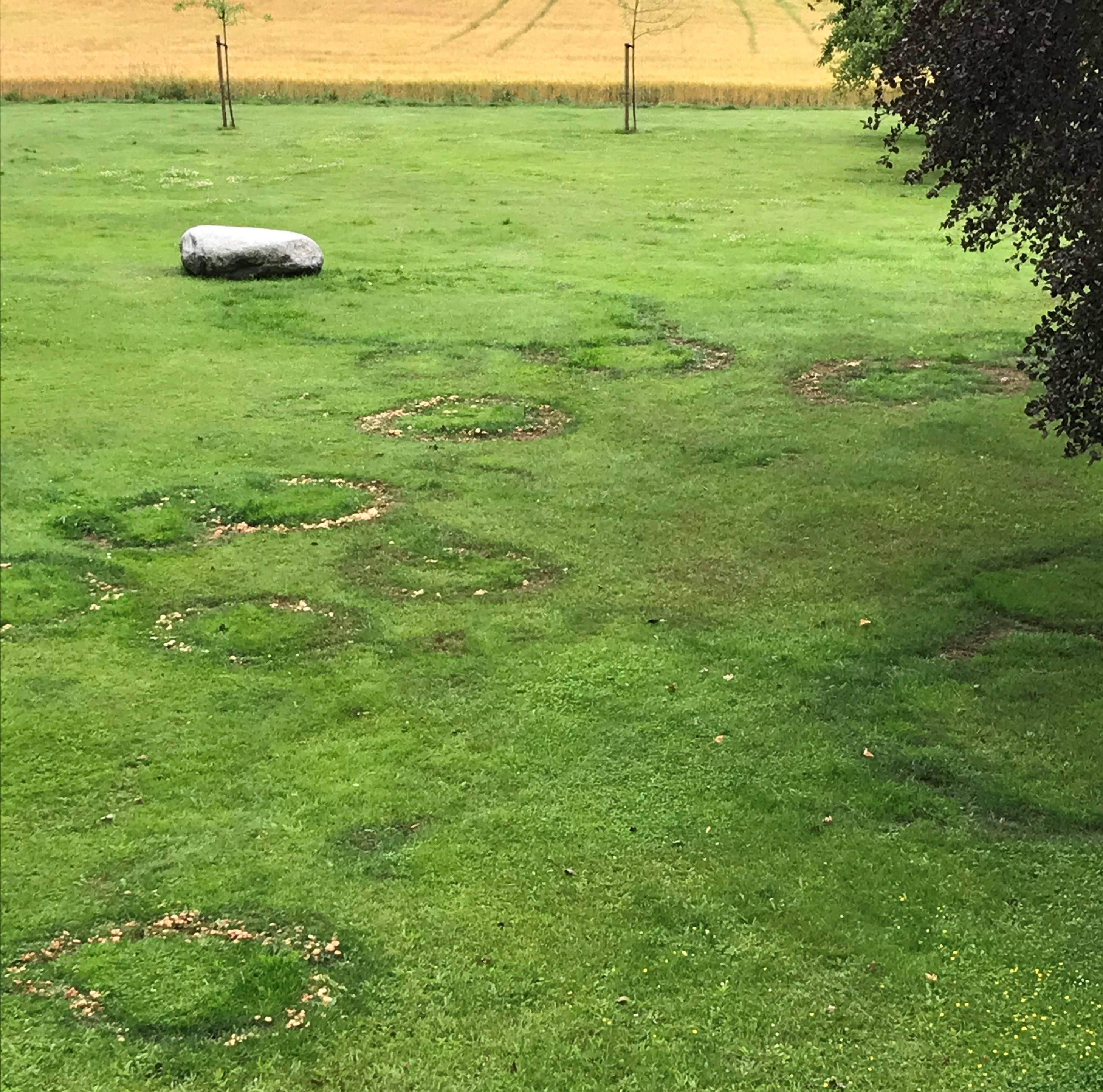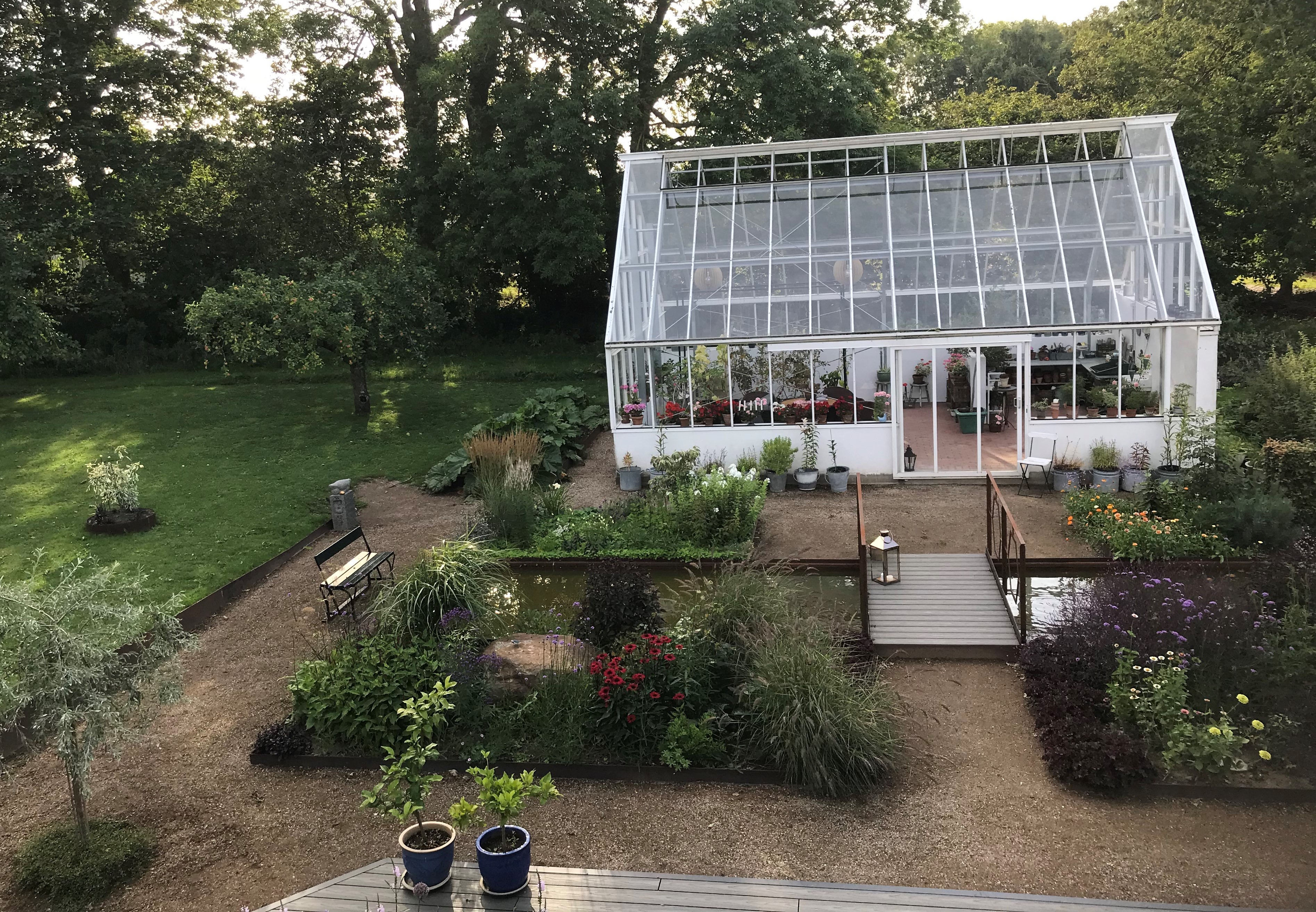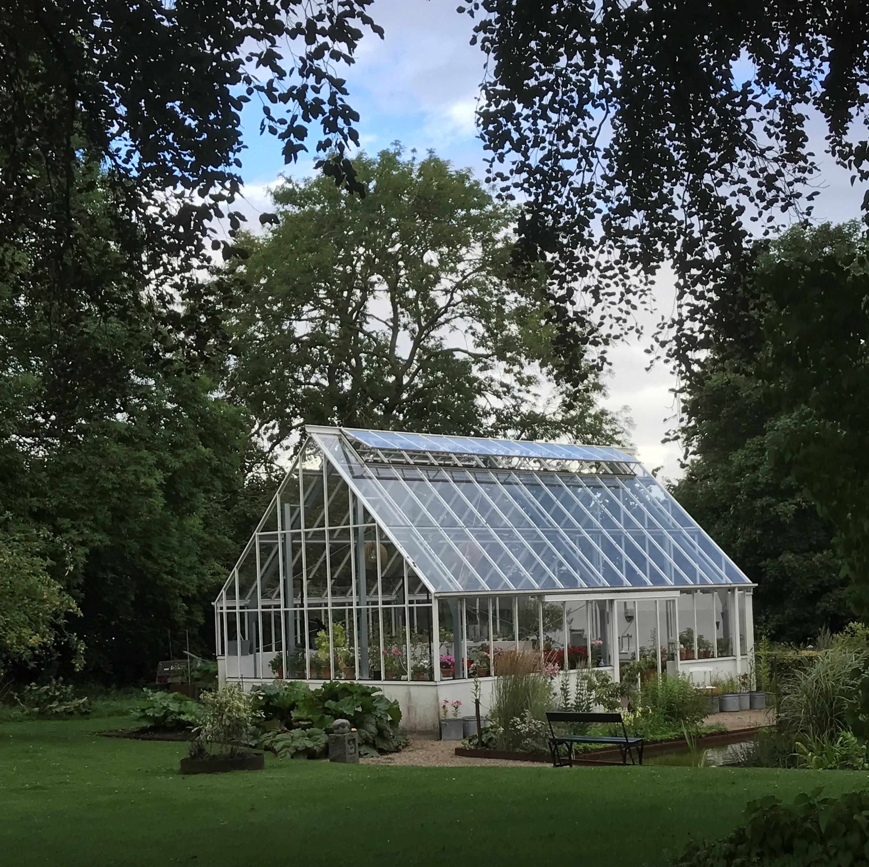 Juni var varm og tør og juli har været den vådeste der er målt. For varmt og for vådt - det har ikke været nemt at komme i haven. Men nu skulle det være da Faxe-Stevns kredsen har inviteret til 80 årsjubilæum i vores have. Så nu måtte vi til det. Hekseringene i plænen har vi ikke gjort noget ved og som vores 5 årige barnebarn der kiggede ned på det fra værelset spurgte: Farmor hvad står der?...... Det er blevet til nydelse på terrassen i de varme aftner og hygge i drivhuset under regnbygerne. Nu kommer snart høsttiden. Kirsebærrene er ordnet, men jeg er bagud på både ribs, solbær og stikkelsbær, men det må vente til efter den 'Åbne have' og jubilæumet