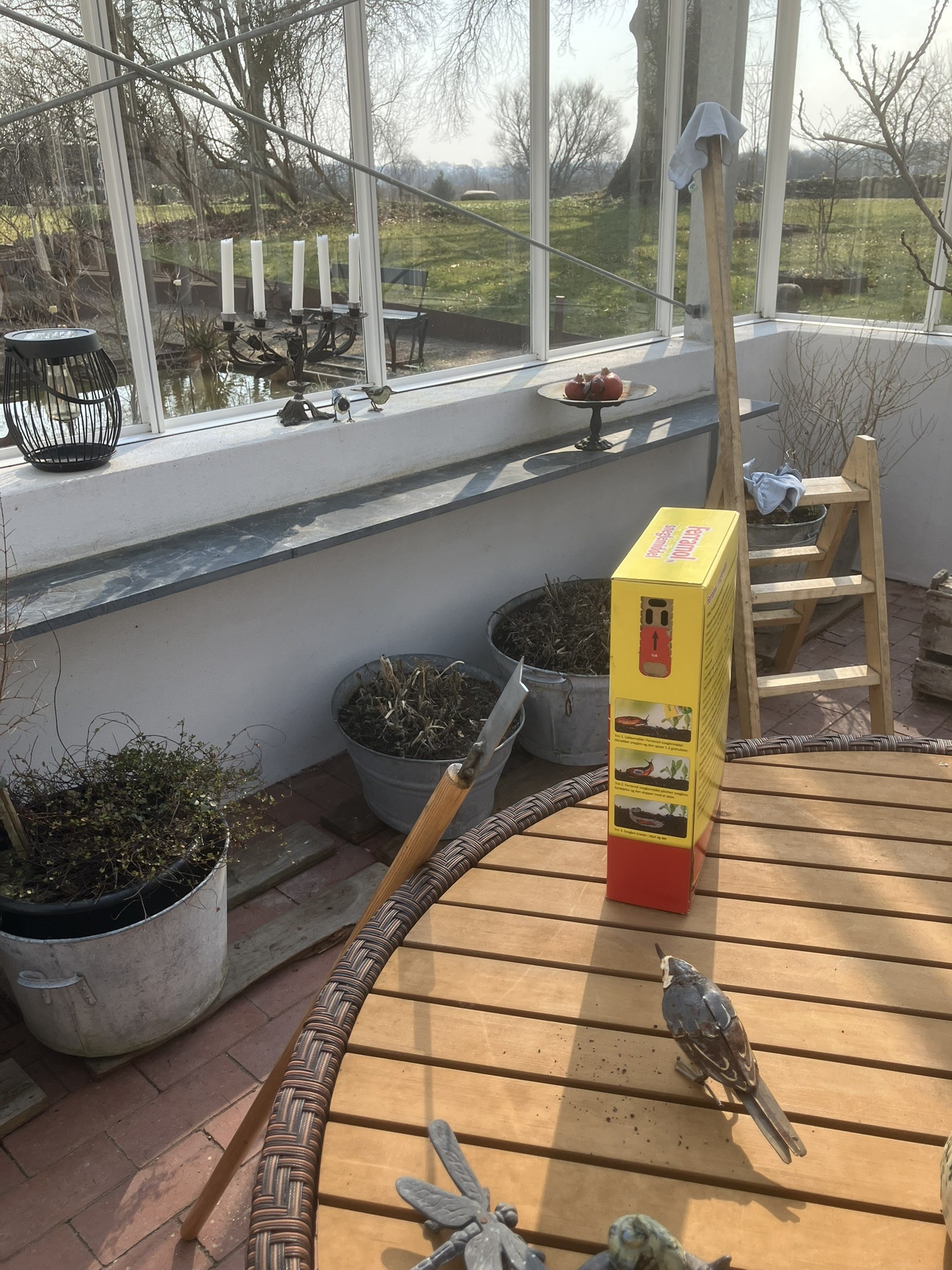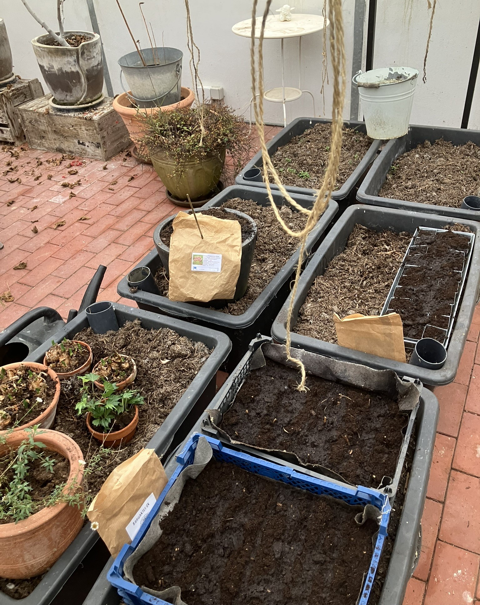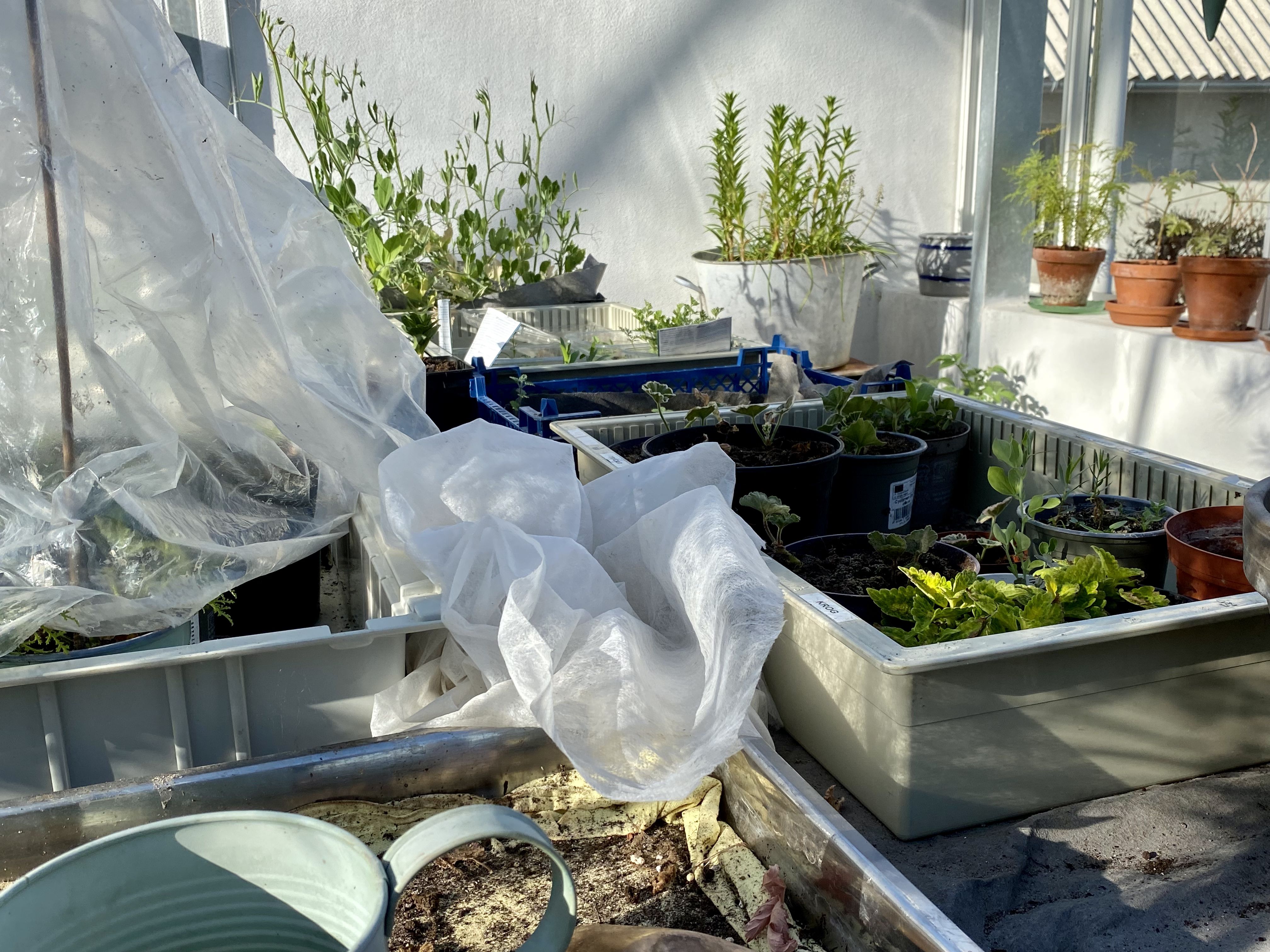 Så er der gang i så og prikling. Se min smarte genbrugsløsning af plastpinde: nummer på pinden og på frøposen. Jeg er virkelig ikke af den tålmodige type, hvad angår så og prikleplanter med hensyn til tilskudslys, afhærdning og så videre, så frøene bliver sået, priklet og sat ud i drivhuset, evt. med en dug over hvis der bliver koldt eller solen skinner for skarpt. Til gengæld må jeg så leve med det tab der naturligvis kommer. Jeg glæder mig til foredraget med Pelargoniepigerne den 30. april, for som I ser på billedet af min duftgeranie, kan jeg godt bruge lidt vejledning til hvordan den kan klippes. Er en duftgeranie for øvrigt en pelargonie? I haven nåede jeg lige at klippe (men ikke rydde grenene op) og gøde roserne før den kraftige regn kom. Den gødning jeg bruger til roser er et par skovlfulde fra gulvet i hønsehuset, dem blander jeg godt op med sand (ligner smuldredejg til tærter) og så giver jeg en lille planteskefuld til hver rose.