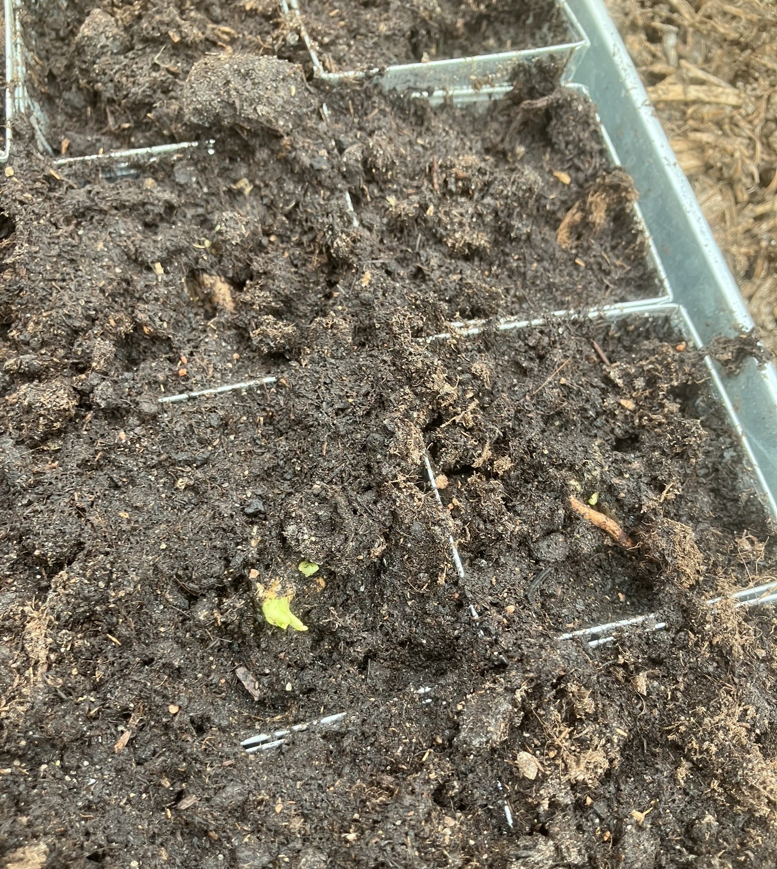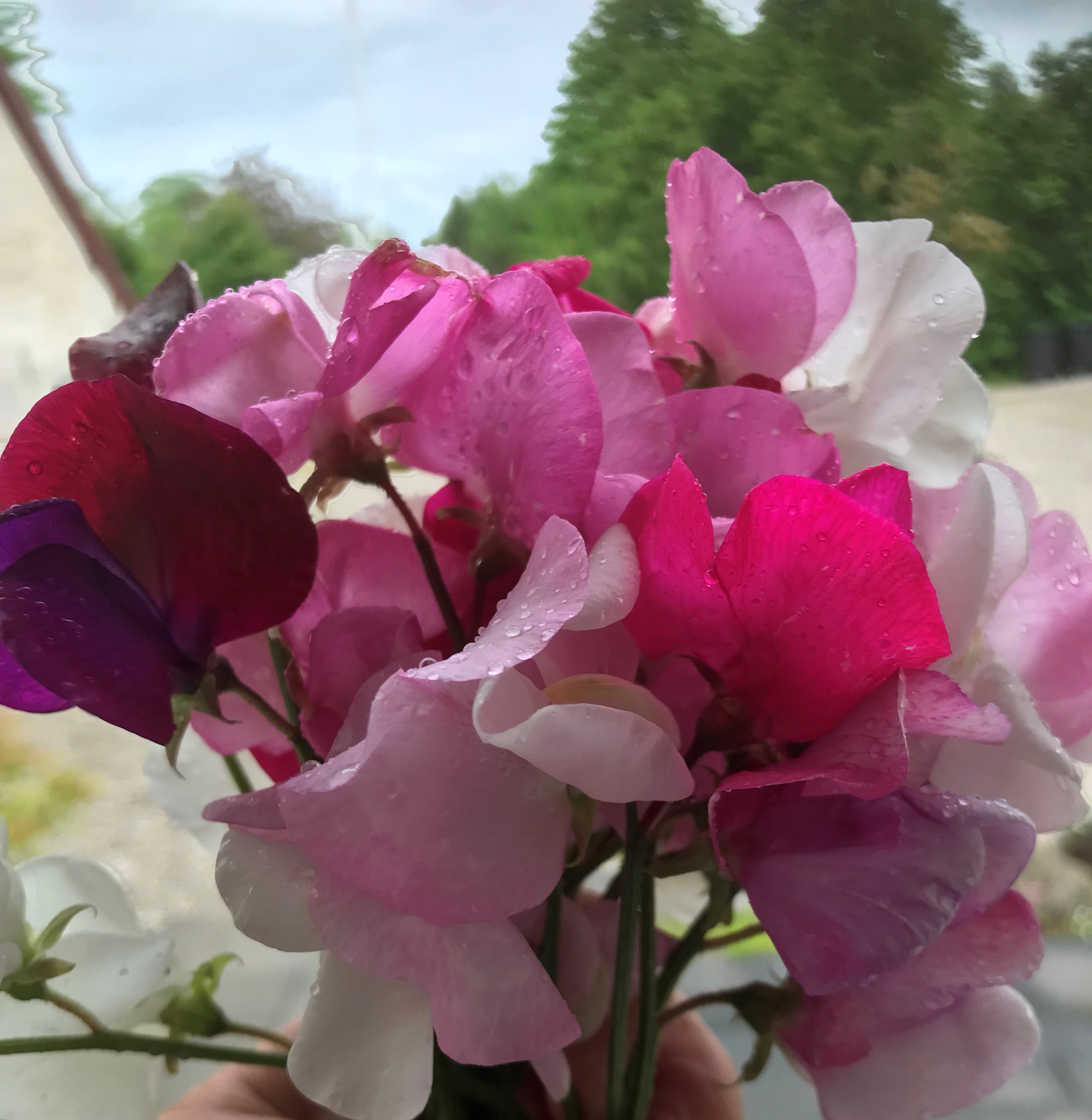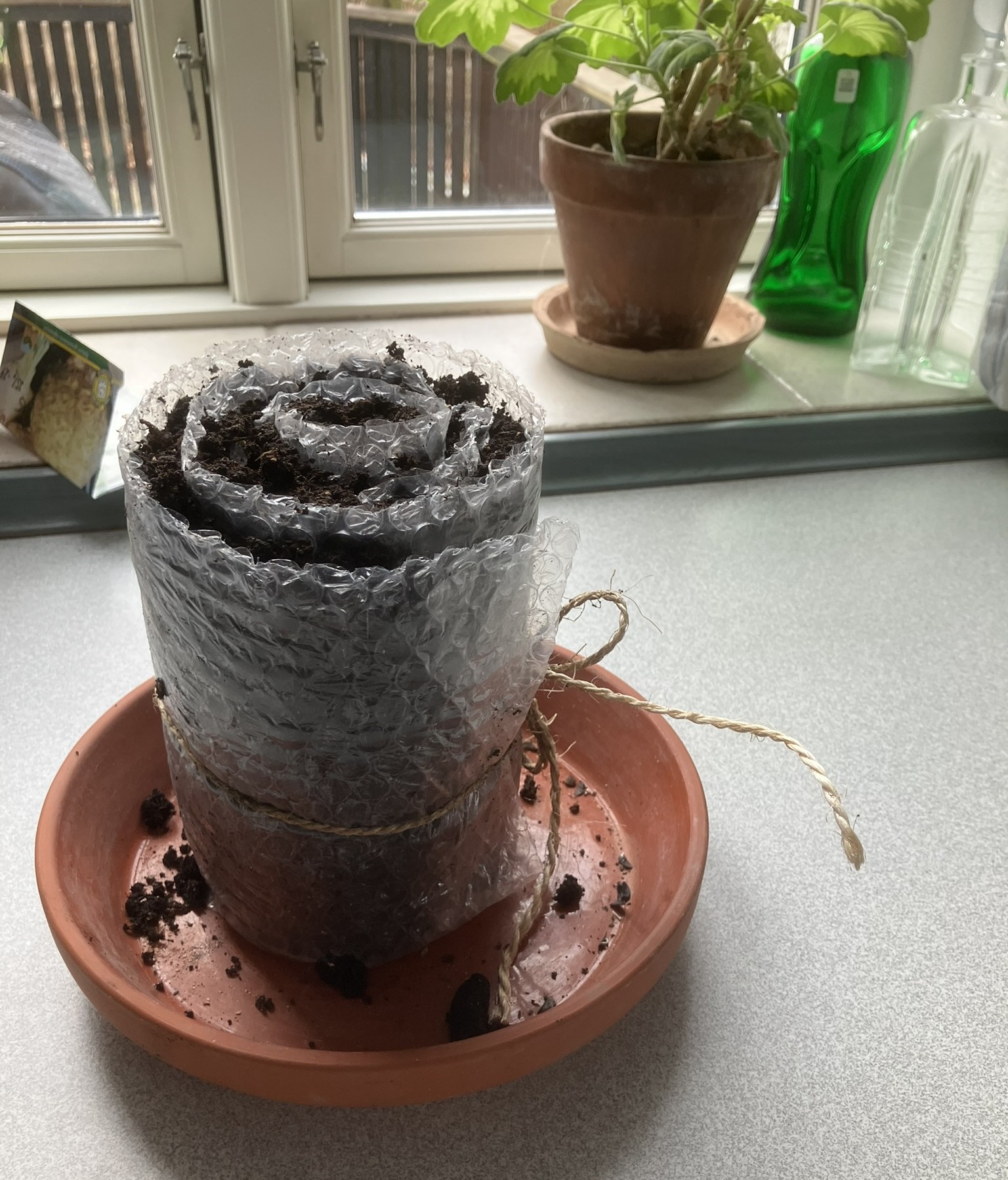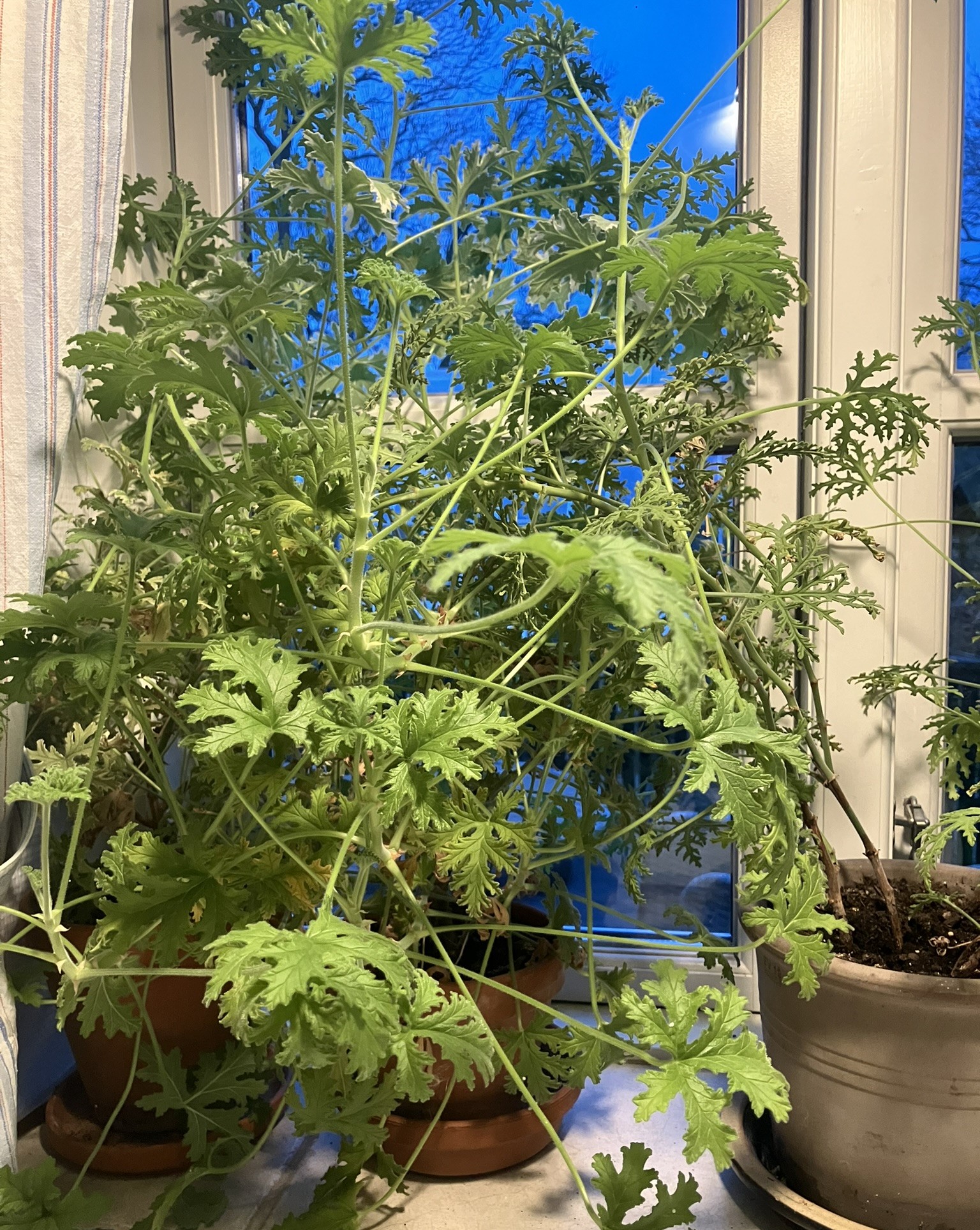 Så er der gang i så og prikling. Se min smarte genbrugsløsning af plastpinde: nummer på pinden og på frøposen. Jeg er virkelig ikke af den tålmodige type, hvad angår så og prikleplanter med hensyn til tilskudslys, afhærdning og så videre, så frøene bliver sået, priklet og sat ud i drivhuset, evt. med en dug over hvis der bliver koldt eller solen skinner for skarpt. Til gengæld må jeg så leve med det tab der naturligvis kommer. Jeg glæder mig til foredraget med Pelargoniepigerne den 30. april, for som I ser på billedet af min duftgeranie, kan jeg godt bruge lidt vejledning til hvordan den kan klippes. Er en duftgeranie for øvrigt en pelargonie? I haven nåede jeg lige at klippe (men ikke rydde grenene op) og gøde roserne før den kraftige regn kom. Den gødning jeg bruger til roser er et par skovlfulde fra gulvet i hønsehuset, dem blander jeg godt op med sand (ligner smuldredejg til tærter) og så giver jeg en lille planteskefuld til hver rose.