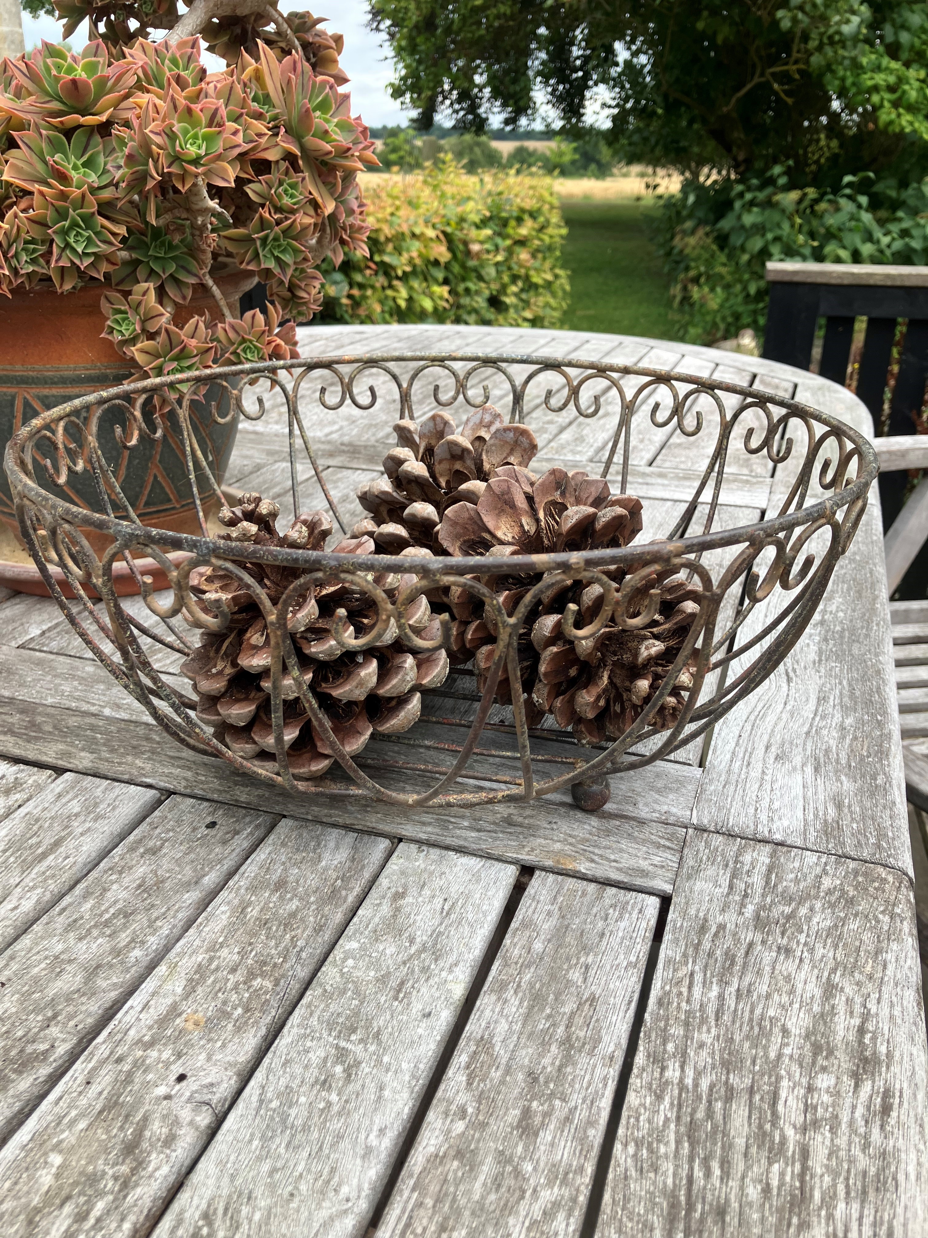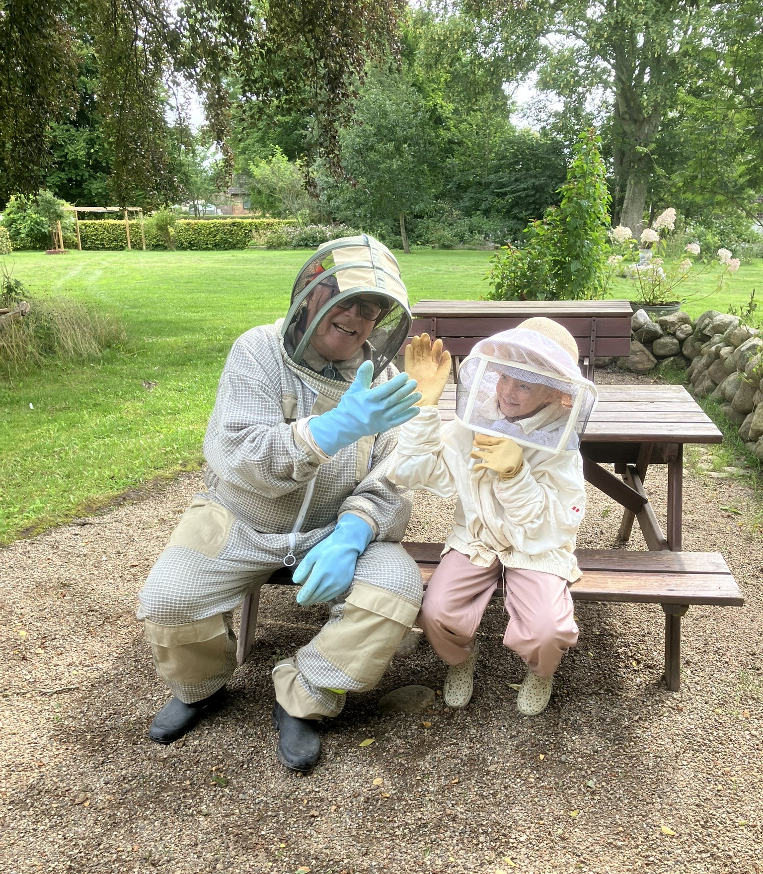 Nu vil jeg ikke skrive om alt der ikke lykkedes i sommer, men nyde det der er gået fint. Hjortetrøsten og kvæsurten trives og klæder hinandens selskab godt. Barnebarnet Mathias hjælper morfar med bierne - en fin høst. Jeg fandt denne flotte trådkurv på et loppemarked, men min kreative sans rækker ikke længere end til at bruge den til kogler eller røde æbler. Gode idéer efterlyses. Måske ses vi på Havemarked Rønnebæksholm?