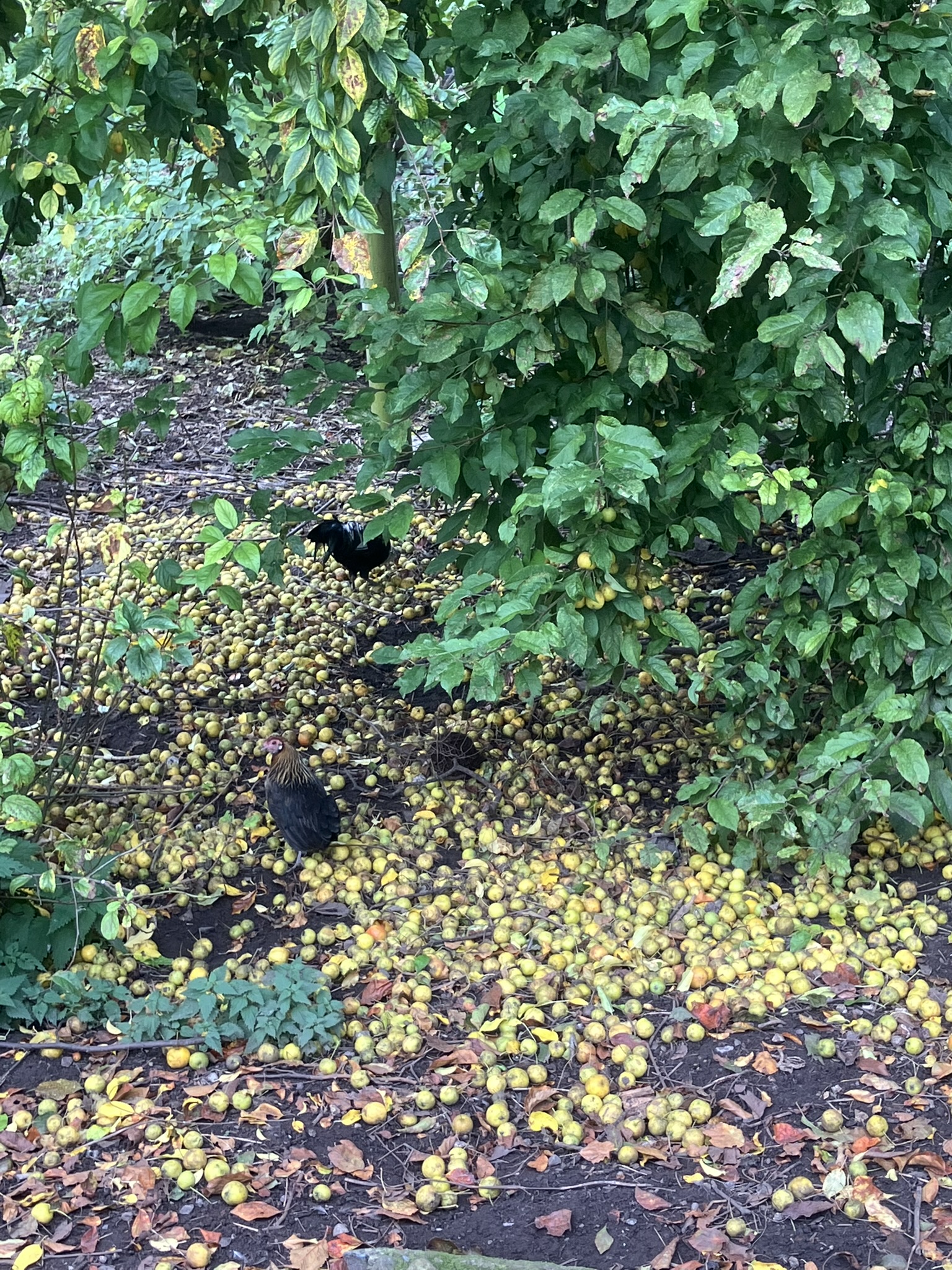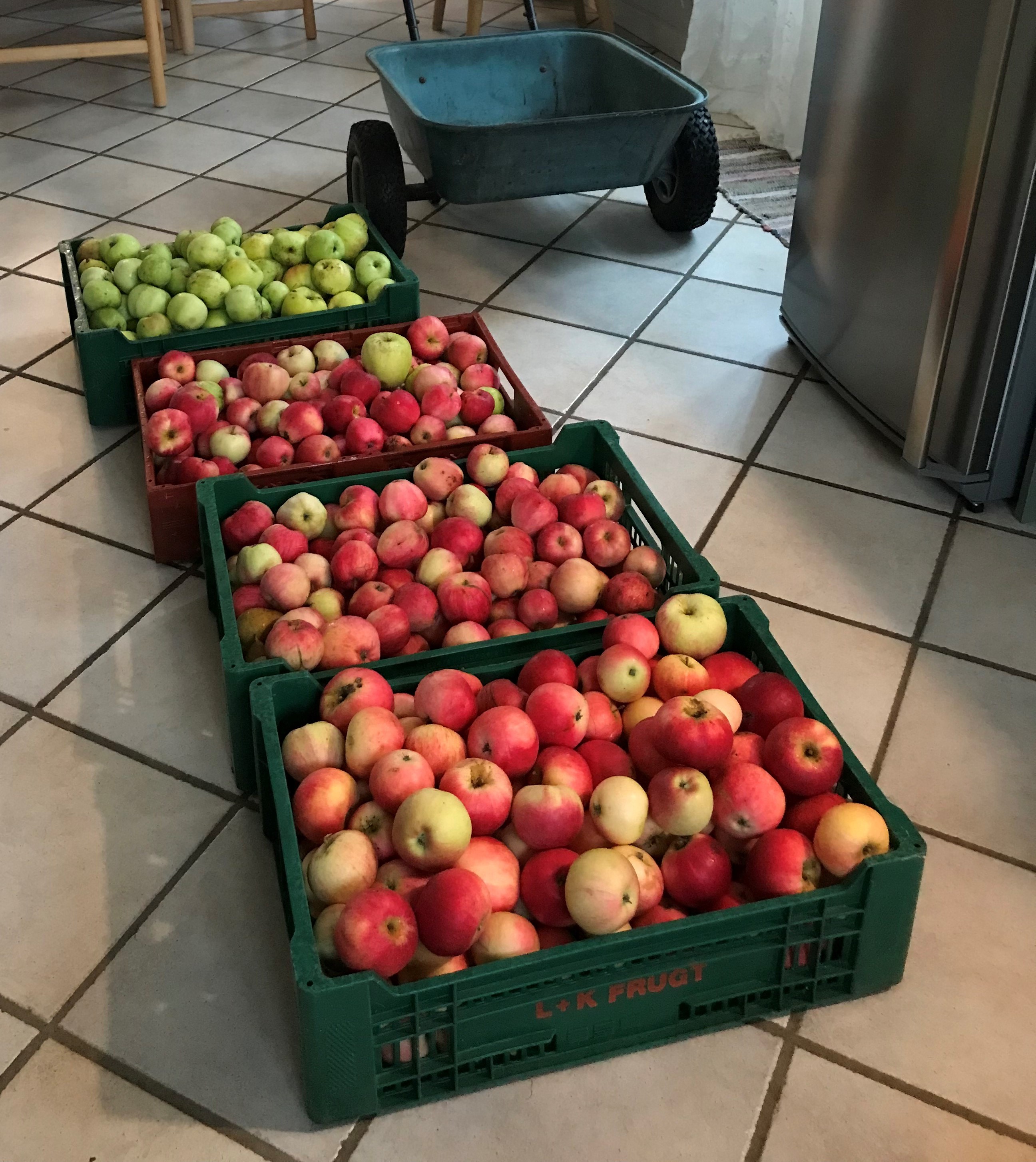 Så blev æblerne høstet og lavet til 30 liter herlig juice. Det er Discovery, Annanas og Filippa. Rosen er den skønne Elaine Paige. Rosernes efterblomstring har godt nok været skøn i år. I haven ses tudser og pindsvin. At rådyrene også er der, har jeg kun indirekte beviser for:) - afgnavede roser og ekskrementer i stenene...., de er helt oppe ved huset.