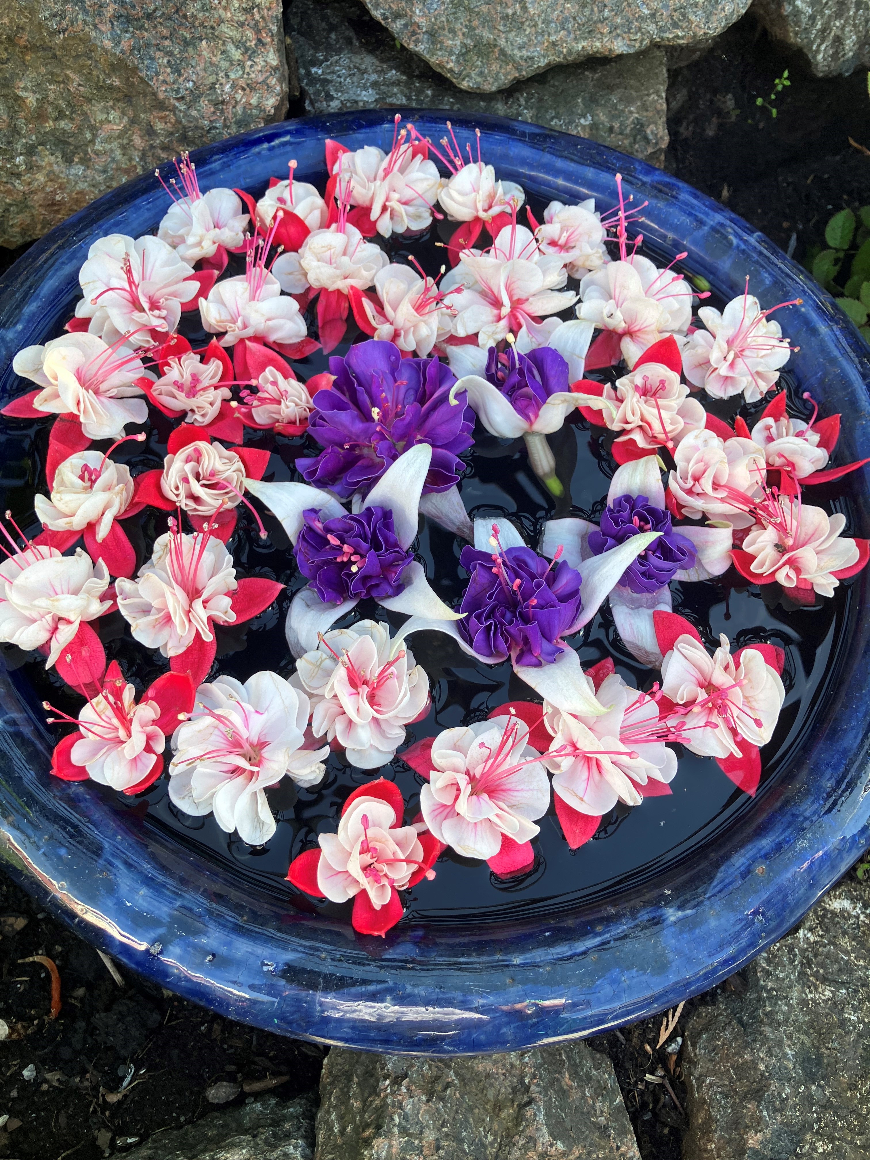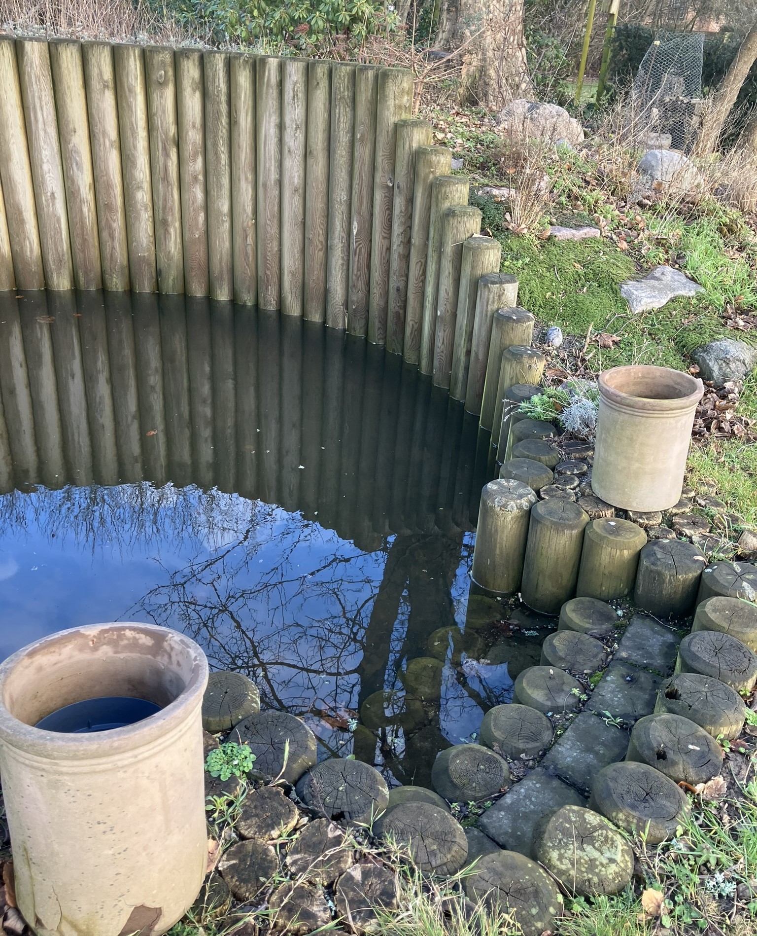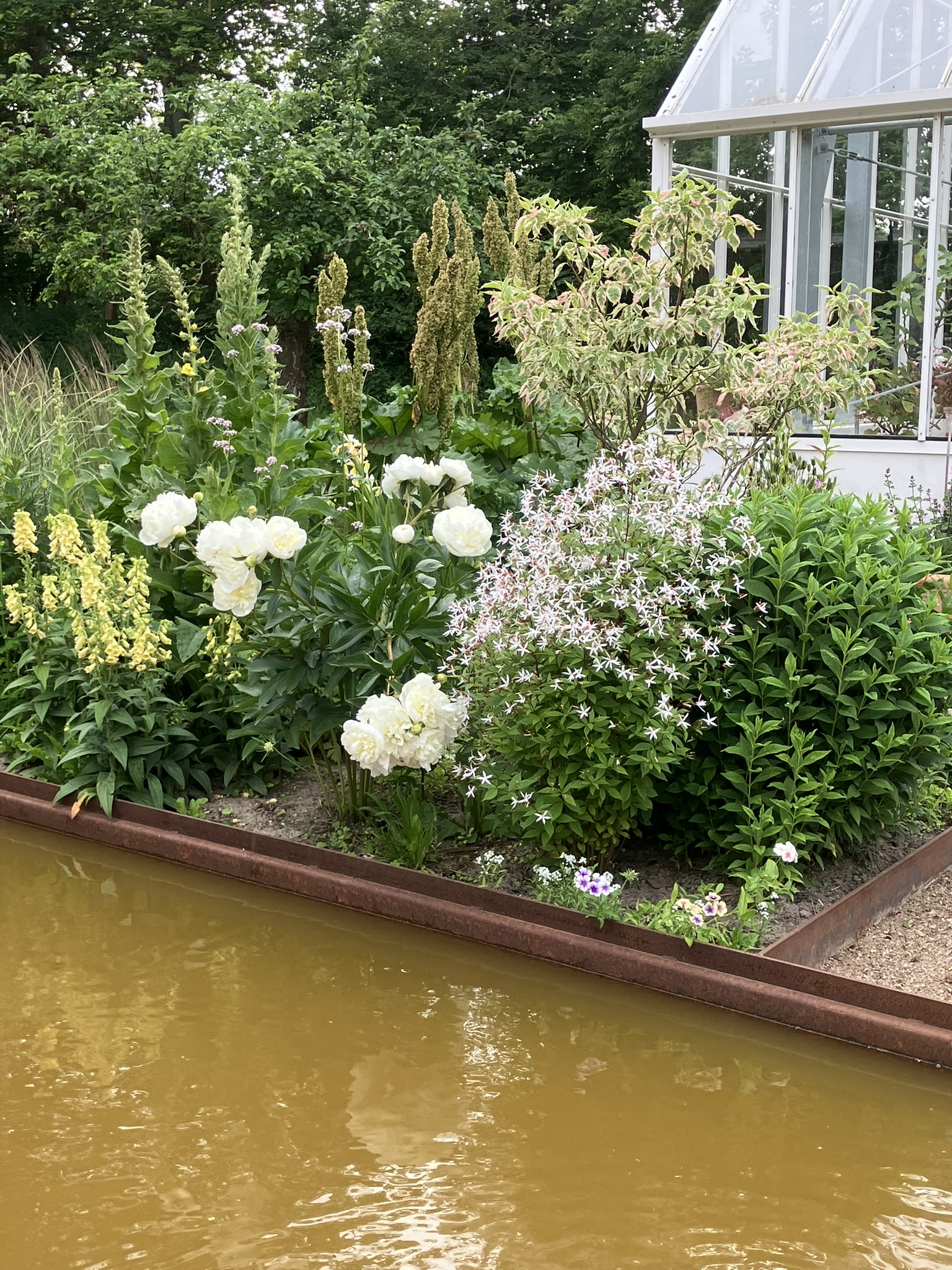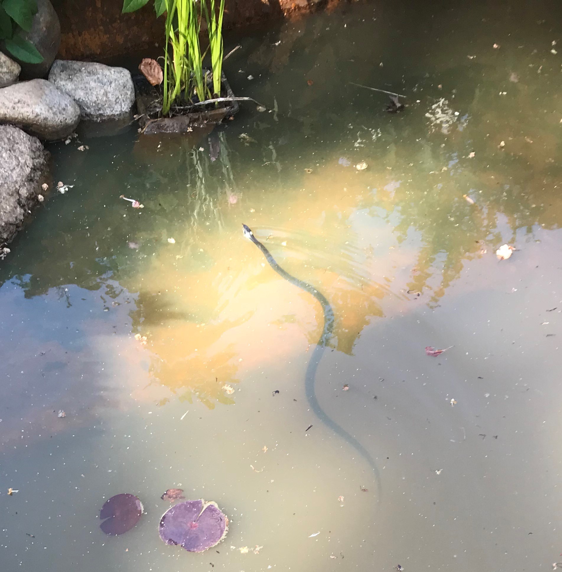 Haven i juni 2023 Nu er det allerede midt juni, tørken har ramt hårdt i år. Roserne og silkepæonerne er godt i gang. Det er andet år vi har vores havebassin. Vi satte 20 fisk ud sidste forår, blandet guldfisk og koikarper. Der har resulteret i mere end 50 småfisk. Hvad gør vi ved dem - det er jo alt for mange? Nu kommer løsningen måske af sig selv, for se lige på billedet hvad vi har fået besøg af - en snog på ca. 60 cm! Den har vi aldrig set på vores ejendom tidligere. Og vil den lille frø overleve besøget? Måske bliver der en naturlig balance..... Jeg glæder mig hvert år til at plukke en lille buket af de skønne velduftende ærteblomster. God sommer.
