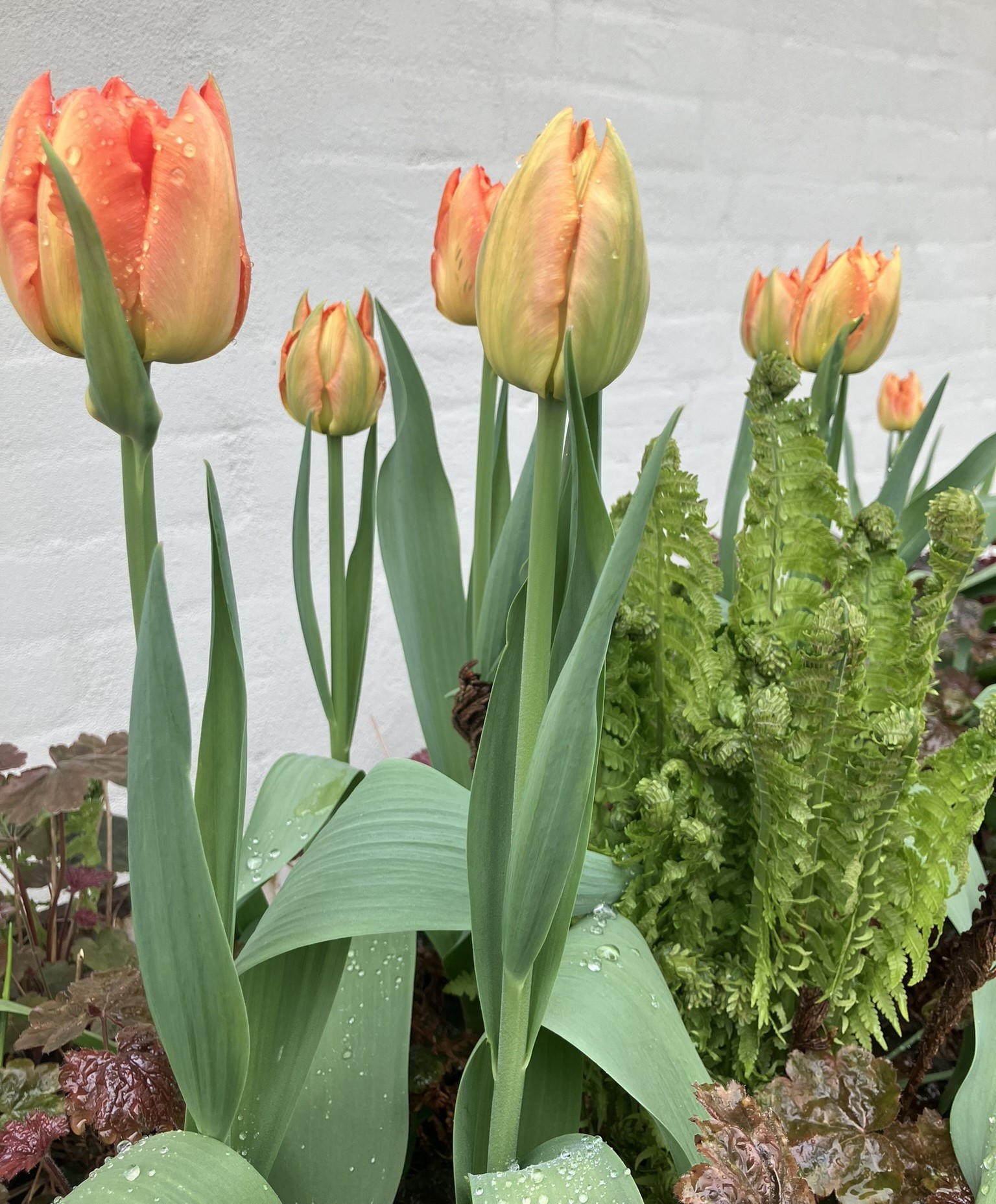 Jeg tog chancen og flyttede alle pelargonier ud i drivhuset - det gik godt- heldigvis. Inspireret af det fine foredrag med Pelargoniepigerne så talte jeg dem jeg har - ca. 60 stykker. Ikke alle er forskellige, men alligevel, det kom bag på mig at det var så mange jeg har. Indenfor er vindueskarmene nu herligt tomme. Vi har rabarber nok, som I kan se på billedet, får desværre ikke brugt så meget af den, men flot er det. Der sker meget på de to uger der er mellem de to billeder af de skønne orange tulipaner som I kan se. Kan ikke huske navnet på dem. Og så skal I da have et billede af Kærmindesøster 'Jack Frost' Til min store glæde har vi igen i år fået haletudser i bassinet, til trods for alt for mange fisk. Nogen der vil have nogle fisk?