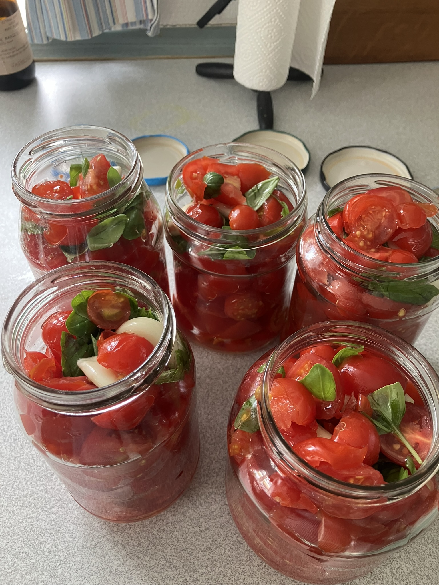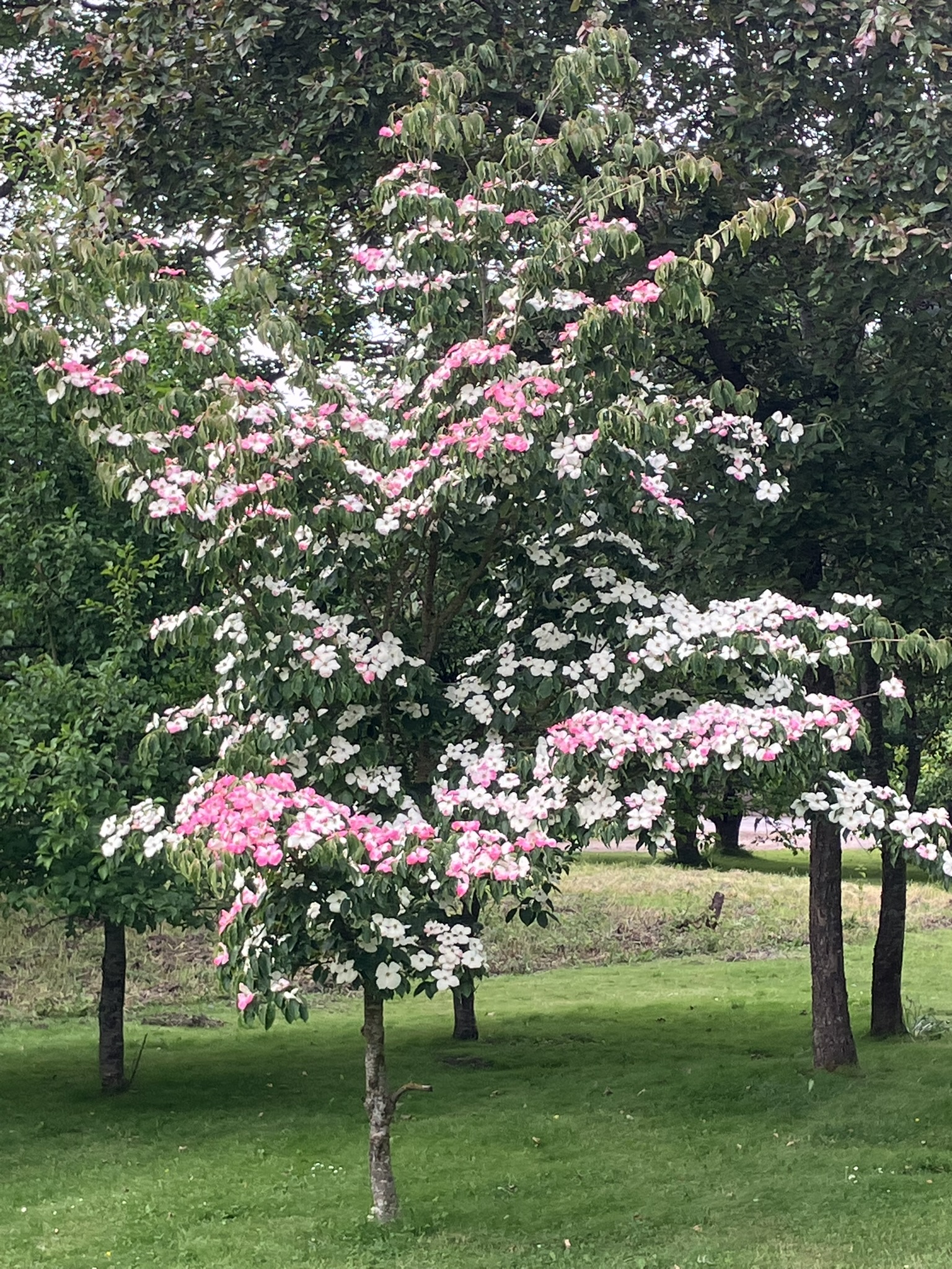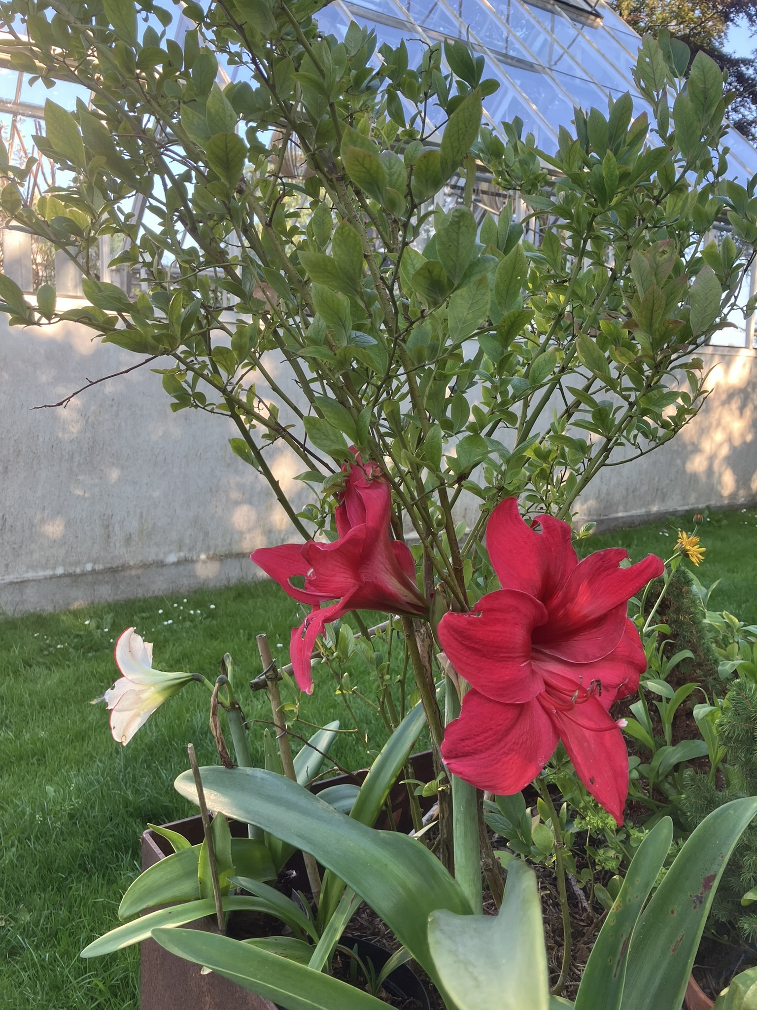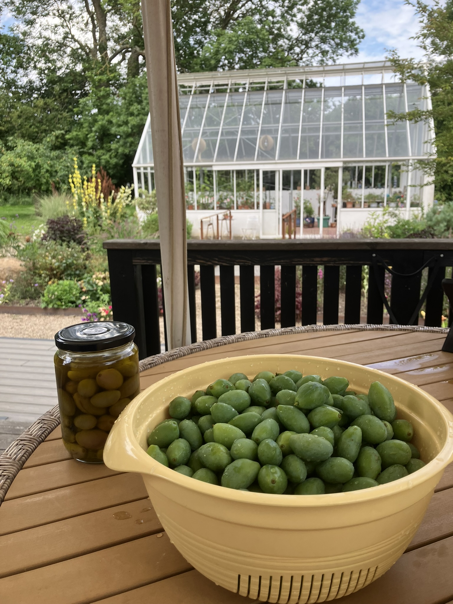 Gad vide om det er fordi jeg er blevet pensioneret? Altså at der går længere tid mellem jeg får sat mig ved computeren..... Jeg har haft tid til at gå grundigere til værks med lugningen, faktisk har jeg totalryddet et stort bed for skvalderkål. Til gengæld har jeg ikke nået alle bed endnu. Det forhindrer mig dog ikke i at nyde det jeg når og det der kommer af sig selv. Se lige den flotte Cornus Kousa. Jeg har virkelig held med Amarylliser - disse to og yderligere en på vej, blomstrer på andet år - ude - i juli! De står i potter i højbedet med blåbærbuske. Jeg tager dem ind i et køligt og lyst rum før frosten kommer og sætter dem der ud om foråret. Billederne af de grønne sveskeblommer og glasset ved siden af er for at vise noget jeg begyndte med for et par år siden. Blommerne plukkes nu i juli, lægges i saltlage 7-8 uger, kommes herefter på glas med god olivenolie, og til næste sommer kan de nydes som grønne oliven med svag smag af blomme:). Husk at tage ud og se andres haver når de holder Åben have, det er sjovt, hyggeligt, man får gode ideer og gerne en god havesnak. God sommer