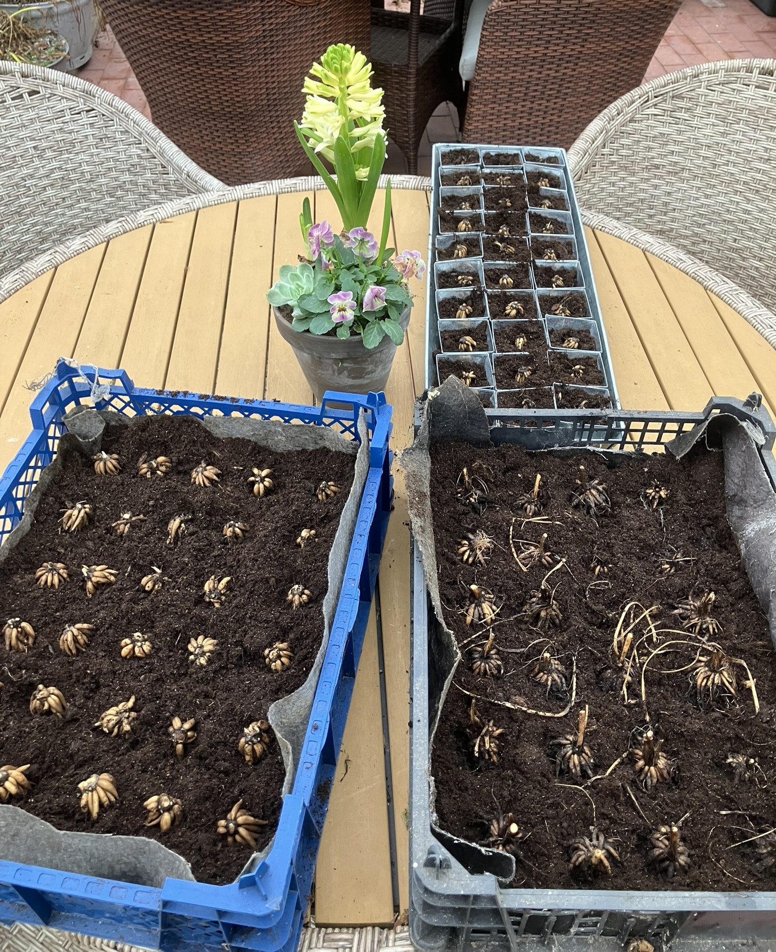 Jeg bliver så glad når solen skinner, når ranunkelknoldene og frøene i vindueskarmen spirer. Jeg har kun i nød klippet et par store græsser for at kunne nyde de flotte påskeklokker der var skjult under dem. resten må vente til der bliver lidt varmere i vejret. Men den daglige tur i haven for at se hvad der pibler og gror kan jeg ikke undvære. God havelyst til jer alle.