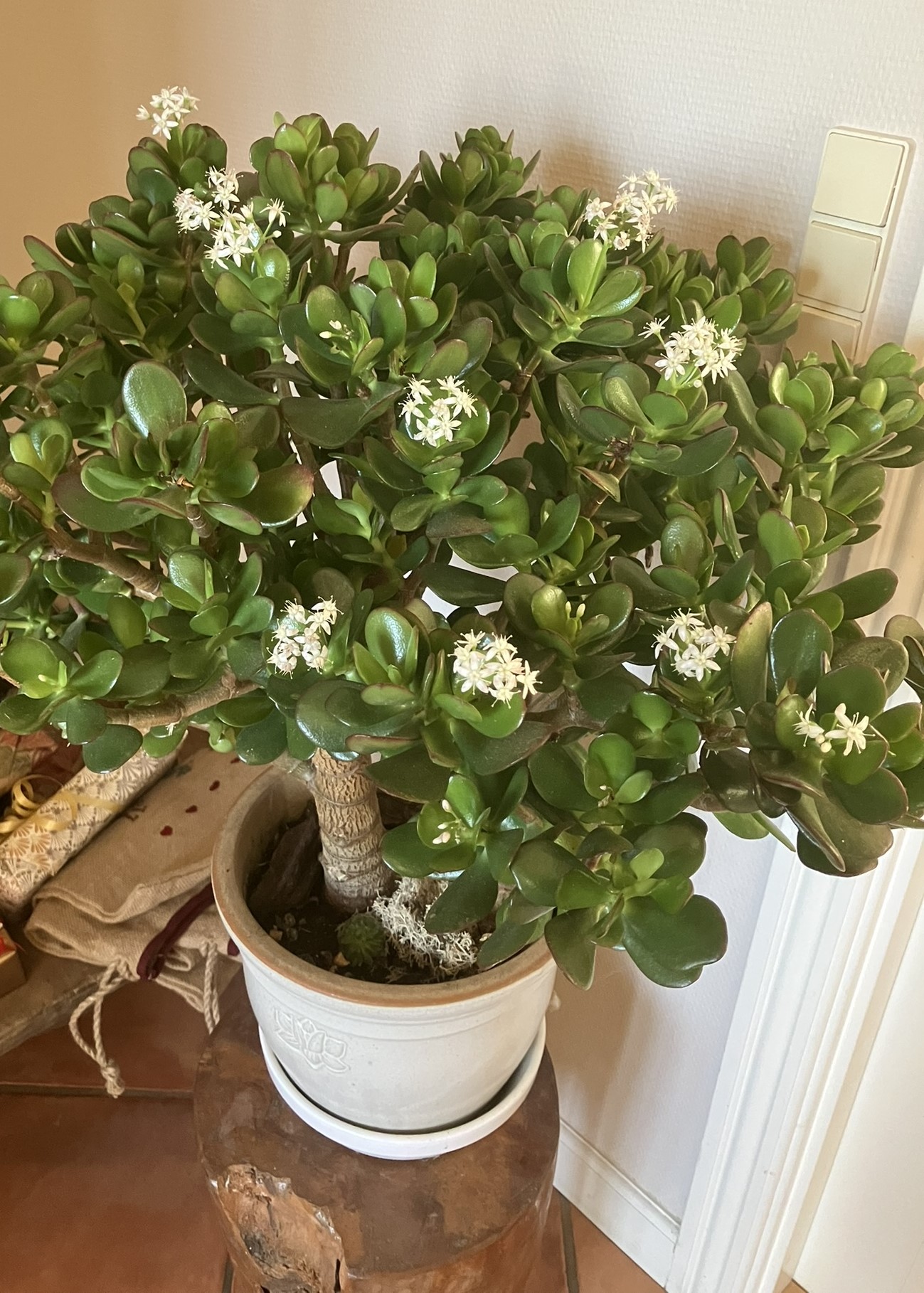 I år bliver haven flot og velpasset! Det er min ambition som nybagt pensionist... Tiden flyver afsted, men jeg tager mig tid til at sidde med en bog, og i ny og næ et glas portvin, mens jeg venter på foråret. I december blomstrede mit Pengetræ/Paradistræ (Crassula Ovata), jeg har hørt at der er sjældent de blomstrer - ved I om det passer? En dag solen skinnede fik jeg sat ranunkelknolde i drivhuset, to nye pakker og 24 knolde jeg har gemt fra sidste år. Det bliver spændende. I haven er der to ranunkelplanter der stikker op fra efterladte knolde. Jeg ønsker jer et godt haveår.