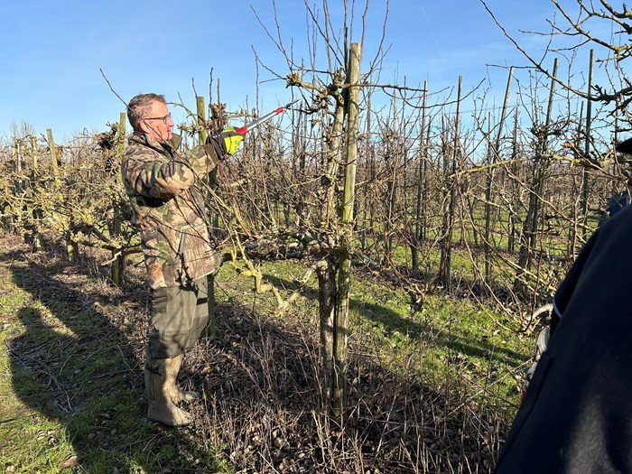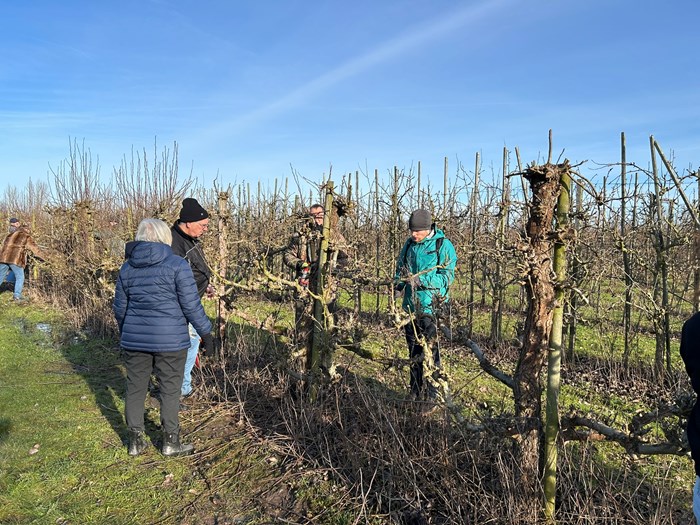 Billeder er fra et tidligere beskæringsarrangement, og viser kursister, der øver sig i beskæring, samt Søren Skov, der er i fuld gang med at vise, hvordan man gør. Fotokredit til Pia Jensen.