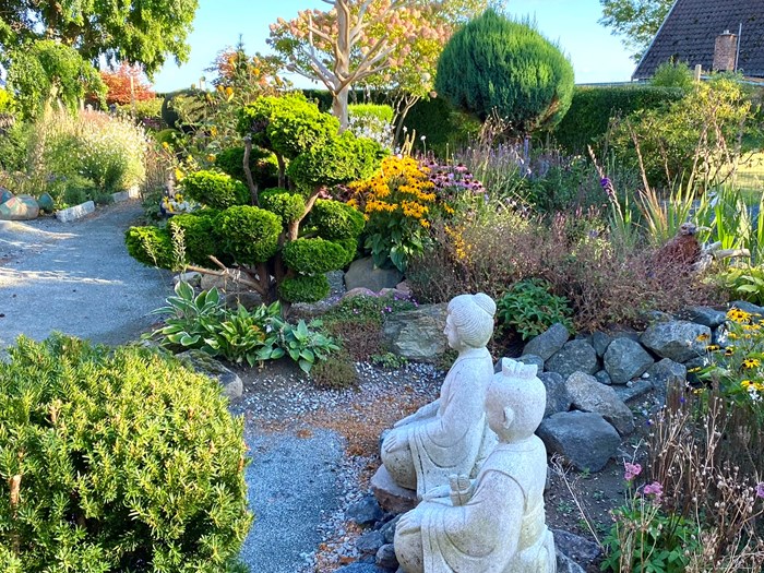 Se hvad man gør når grundvandet står så højt, at underlaget i bassinerne i den japanske have, skubbes op. I løbet af 2025 og 2025 har ægteparret arbejdet med haven, omlagt og brugt den japanske have son grundlag for en mere staudeorienteret have. Det betyder at der virkeligt er arbejdet med udvalget og sammensætningen af stauderne. Men elemeterne med sten og figurer og de mange formklippede buske er naturligvis stadig i haven.