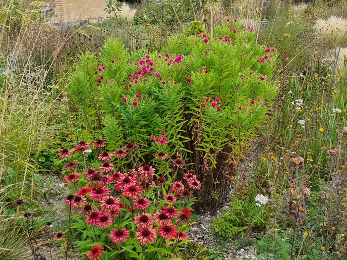 På to sider er anlagt såede bede: Et med hjemmehørende arter og et med en blanding med flere blomstrende 1- og 2-årige.