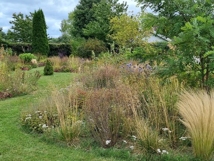 De 3 organisk formede staudebede er tilplantet med de samme planter og græsser, strategisk placeret, så der altid er blomster og farver. Græsserne vajer smukt imellem og over stauderne.