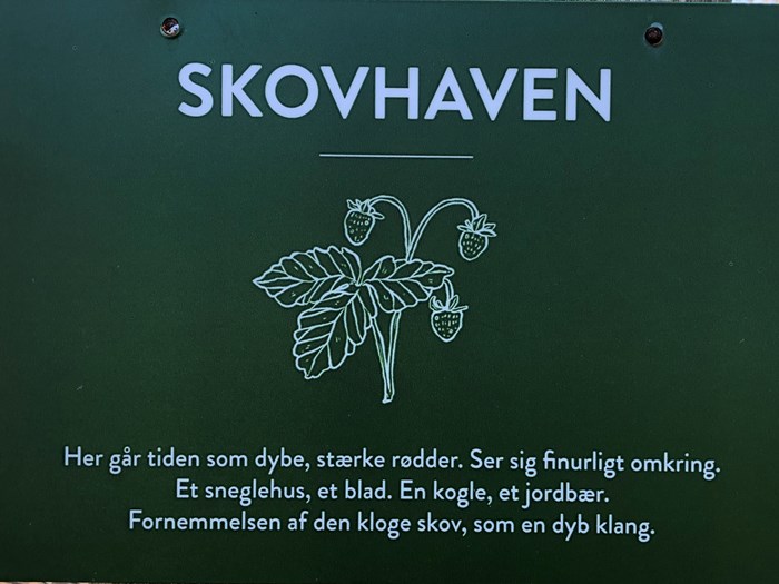Haverne: Bærhaven, Tehaven og Pergolahaven, Bålhaven, Helsehaven, Frugthaven, Skovhaven, Blomsterhaven og Forsythialunden - Samt , Fælleden, Kapelparken, Kirkegården.