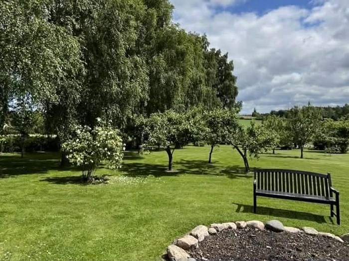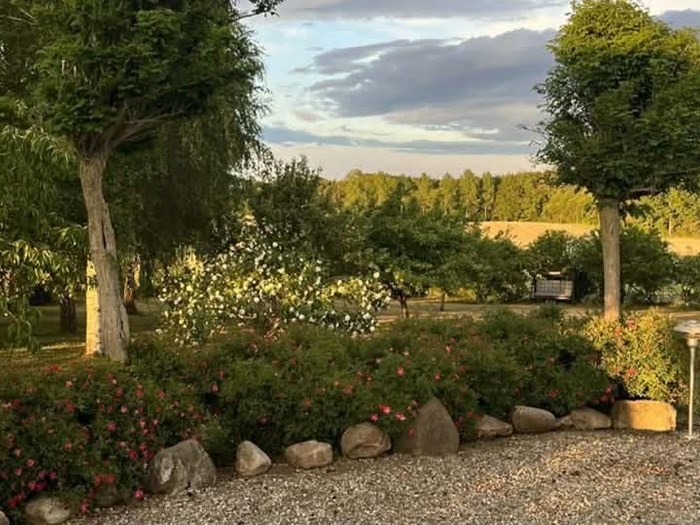 Vores have er omgivet af kuperet terræn og smuk natur, så haven er primært forgrund for det omkringliggende landskab.