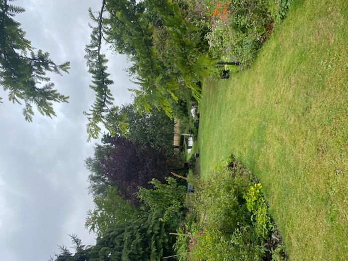 En stor have med mange træer buske og blomster. Der er sat en del fuglekasser op, og stengærder, kvashegn og døde grene giver gode gemmesteder for kryb og kravl. Jeg samler selv urter til te og mad, så mange spiselige planter har sneget sig ind, ligesom brændenælder, ramsløg og skvalderkål også har deres plads. Haven er blevet en del vildere med årene.
