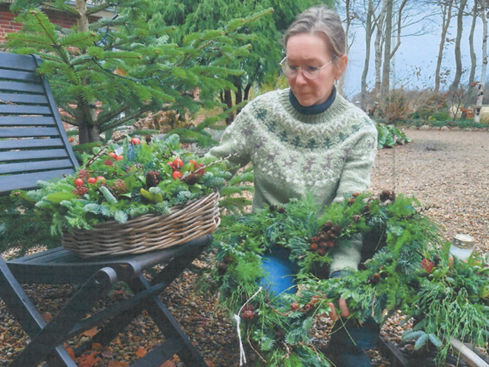 I mit julebinderi vil jeg bruge frisk grønt, grene, kunstige blomster og grønt og jeg vil mixe det.