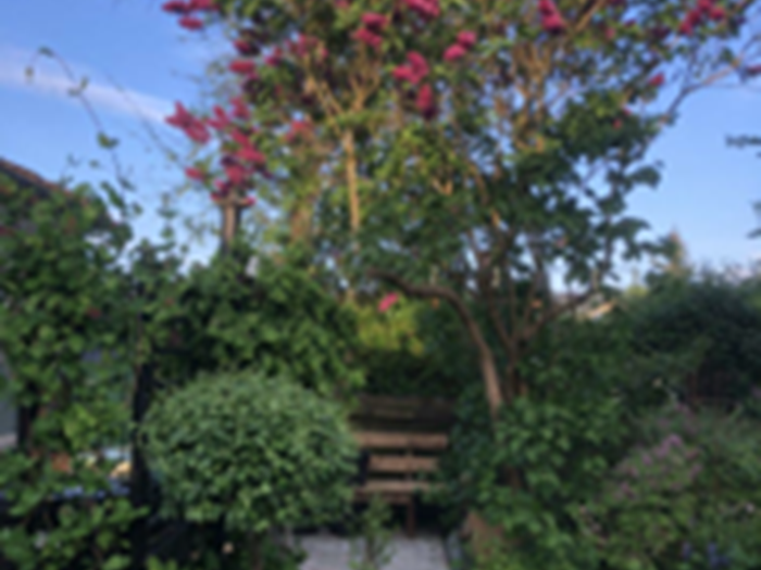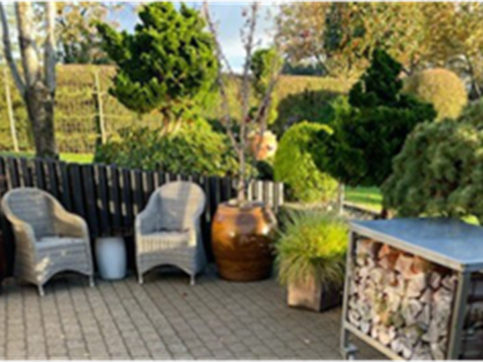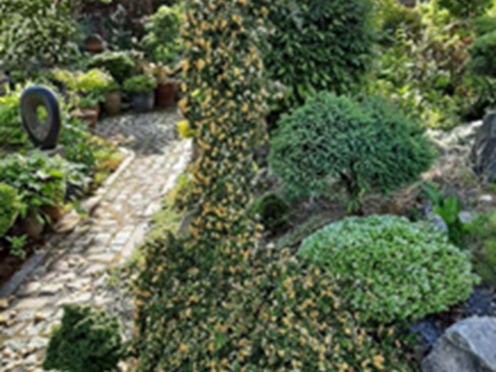 Deres hyggelige have indeholder lidt af hvert: En del rhododendron, hosta, aurikler og små formklippede træer og buske. Desuden hyggekroge, rustent jern og et dejligt drivhus med siddepladser og planter.