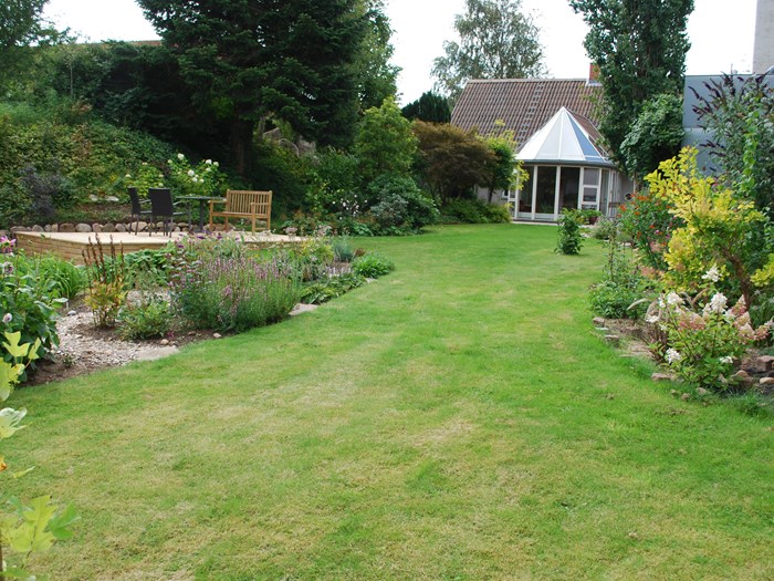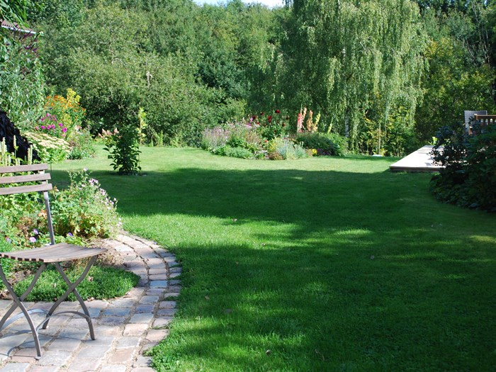 Malene og Morten købte deres hus – den gl. skole i byen for 8 år siden, på det tidspunkt var ingen af dem havemennesker, men interessen er vokset. Malene kan lide at der er blomster til buketter og Morten går mere op i buske og træer. Grunden er kuperet med fliser og siddepladser og haven veksler fra at være plejet omkring huset og mere vild i bunden af haven.